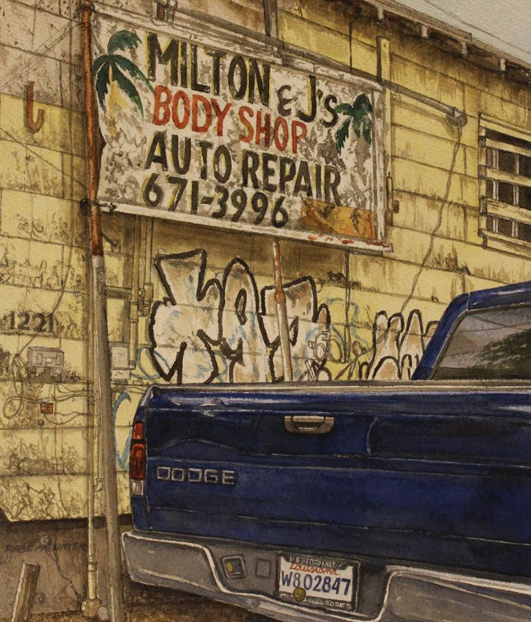IMAGES (left top to bottom): Shirley Rabé Masinter, Tattoos (detail), 2014. Watercolor on paper. Courtesy of the Shirley Rabé Masinter Estate; Shirley Rabé Masinter, Milton & J's, 2018. Watercolor on paper. Courtesy of the Shirley Rabé Masinter Estate; (above top to bottom) Kathryn Keller, Front Porch, 2016. Oil on paper. Courtesy of the artist.; Kathryn Keller, Pier, 2022. Oil on canvas paper. Courtesy of the artist.