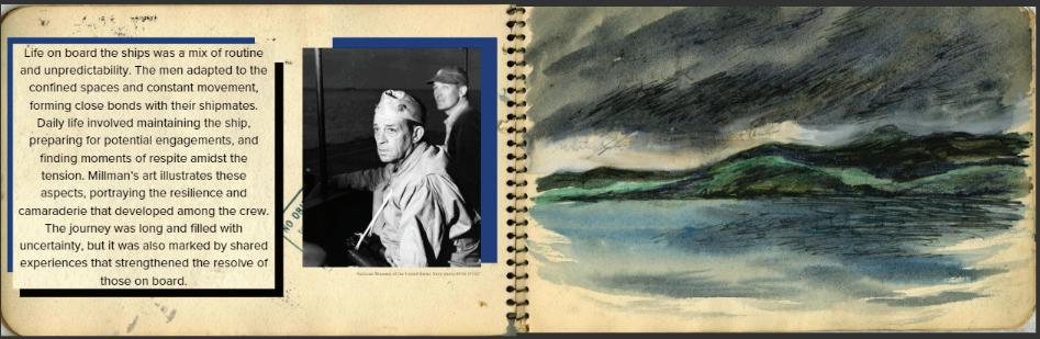 Museum intern Sydney Grafals, a student from the LSU Discover Undergraduate Research program, worked over the summer to investigate Millman’s wartime activities and the role of combat artists, and to interpret individual scenes recorded in the imagery. With help from Marianna Luquette, registrar at the LSUMOA, and Chase Tomlin, the associate curator at the WWII Museum in New Orleans, Grafals was able to decipher many of the sketches, most of which did not have notations or identifiers, and ascertain unique details about the people, places, and events Millman documented.