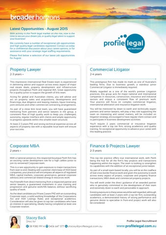 Latest Opportunities - August 2015 With activity in the Perth legal market on the rise, now is the time to secure your dream job, or quality legal talent to support your business! We currently have a number of exceptional job opportunities and high quality legal candidates registered. Contact us today for a confidential discussion about your career options, or for assistance with your strategic legal staffing requirements. Please find below a selection of our latest job opportunities for August.
