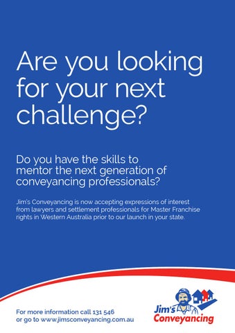 Are you looking for your next challenge? Do you have the skills to mentor the next generation of conveyancing professionals? Jim’s Conveyancing is now accepting expressions of interest from lawyers and settlement professionals for Master Franchise rights in Western Australia prior to our launch in your state.