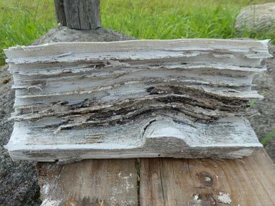 The next day, I scavenged a piece of birch wood that had once been part of the old barn and set to work carving it into a feathery leg, inspired by the Jurassic-looking stalks that fly above. I carved triangular holes and filled them with different colored lichens, mirroring what already grew on the tree.