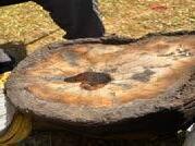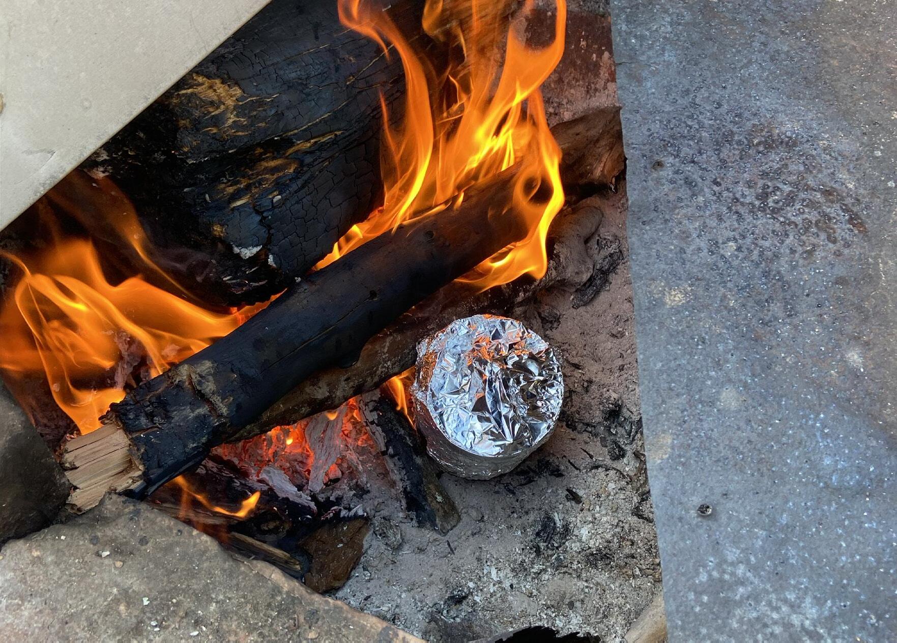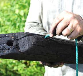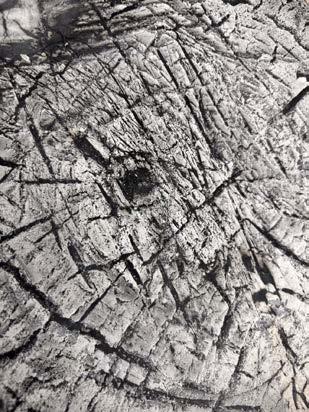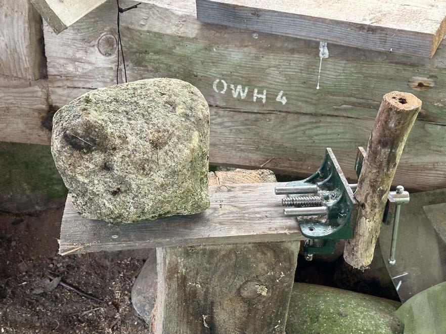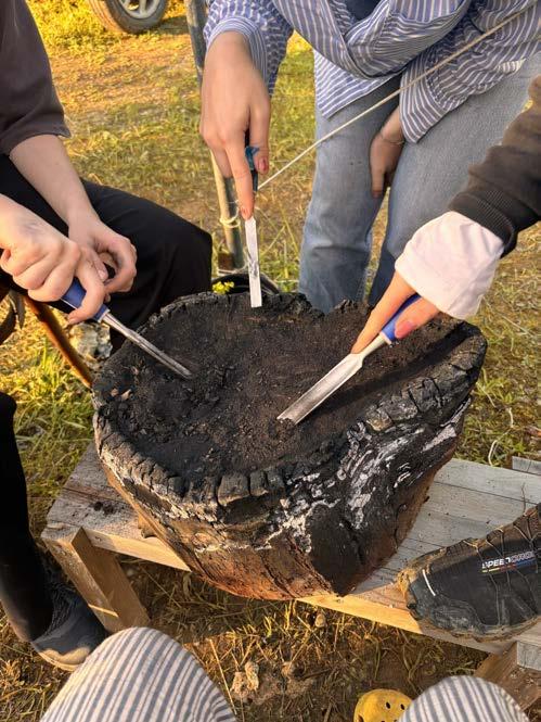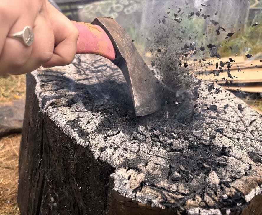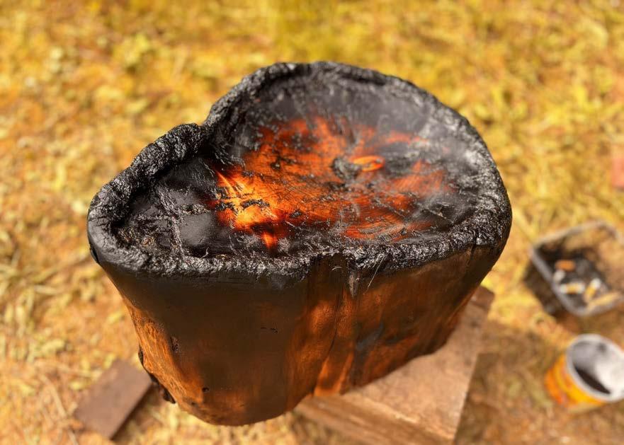 In order to carve out a bowl deep enough to hold water in a hardwood log, the most efficient process was to burn away layers of the wood, turning it into charcoal, and creating a more fragile, easily chiseled away material. This was done by placing the log directly onto the flames of the fire at Stonehenge, as well as placing hot logs into the centre of the piece. This process also caused the sides of the log to start burning away as the flame was not controlled, giving a beautiful gradient colour to the wood once the charcoal was sanded away.