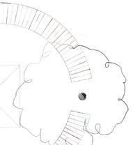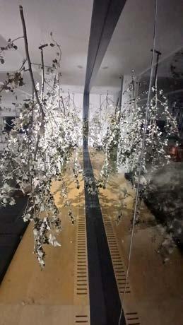 The greenhouse works by collecting rainwater runoff from the surrounding area and the roof into the lowered stony floor at the center of the space. This water then evaporates and collects on the ceiling to then fall back on the plants.