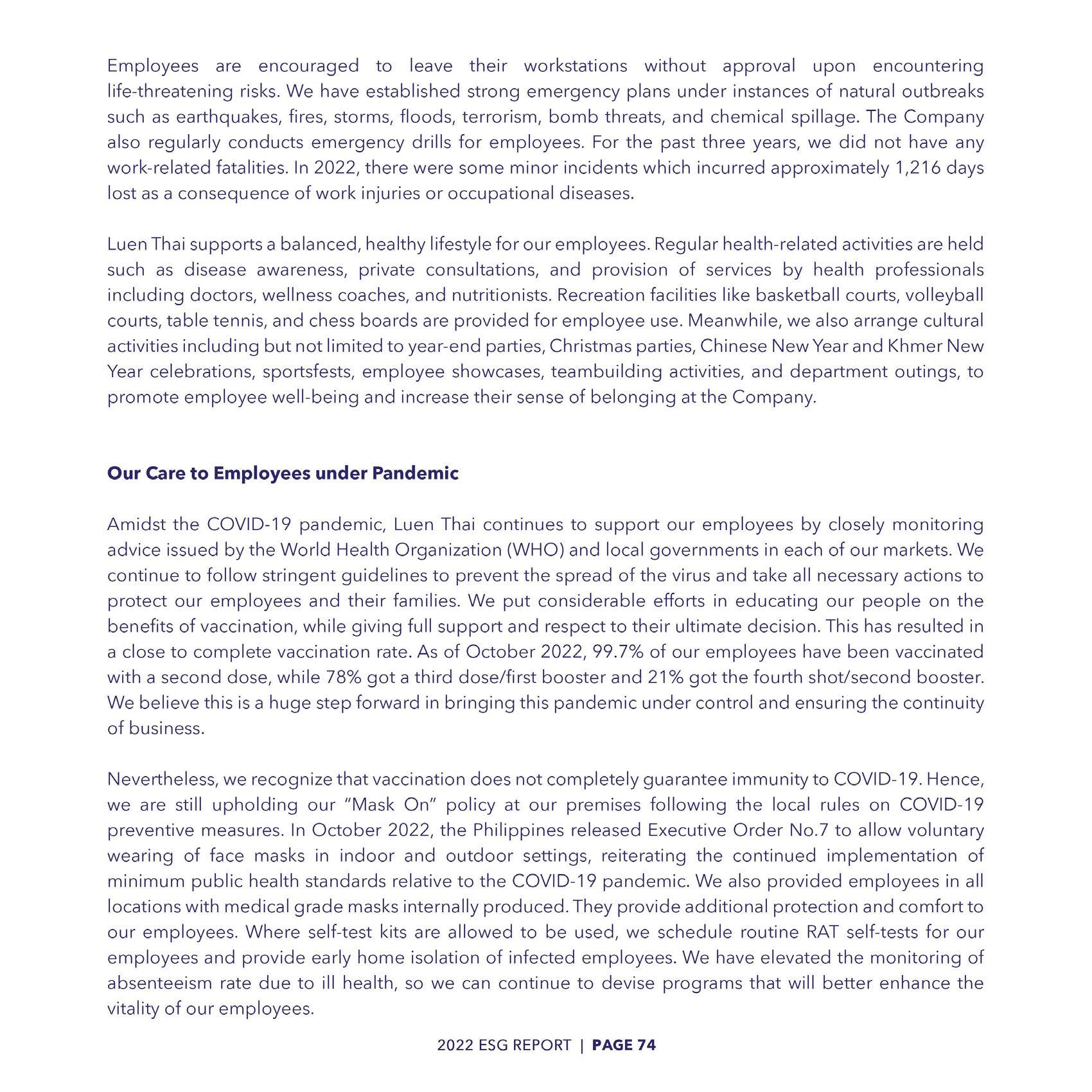 Our employees are our core assets. We focus on creating a diverse and inclusive environment that respects and prioritizes the well-being of our employees. Ultimately, it results in higher productivity, motivation, and commitment. As of early March 2022, over 99% of our employees have received the COVID-19 vaccine, while actively giving our members access to flexible working hours and remote working alternatives.