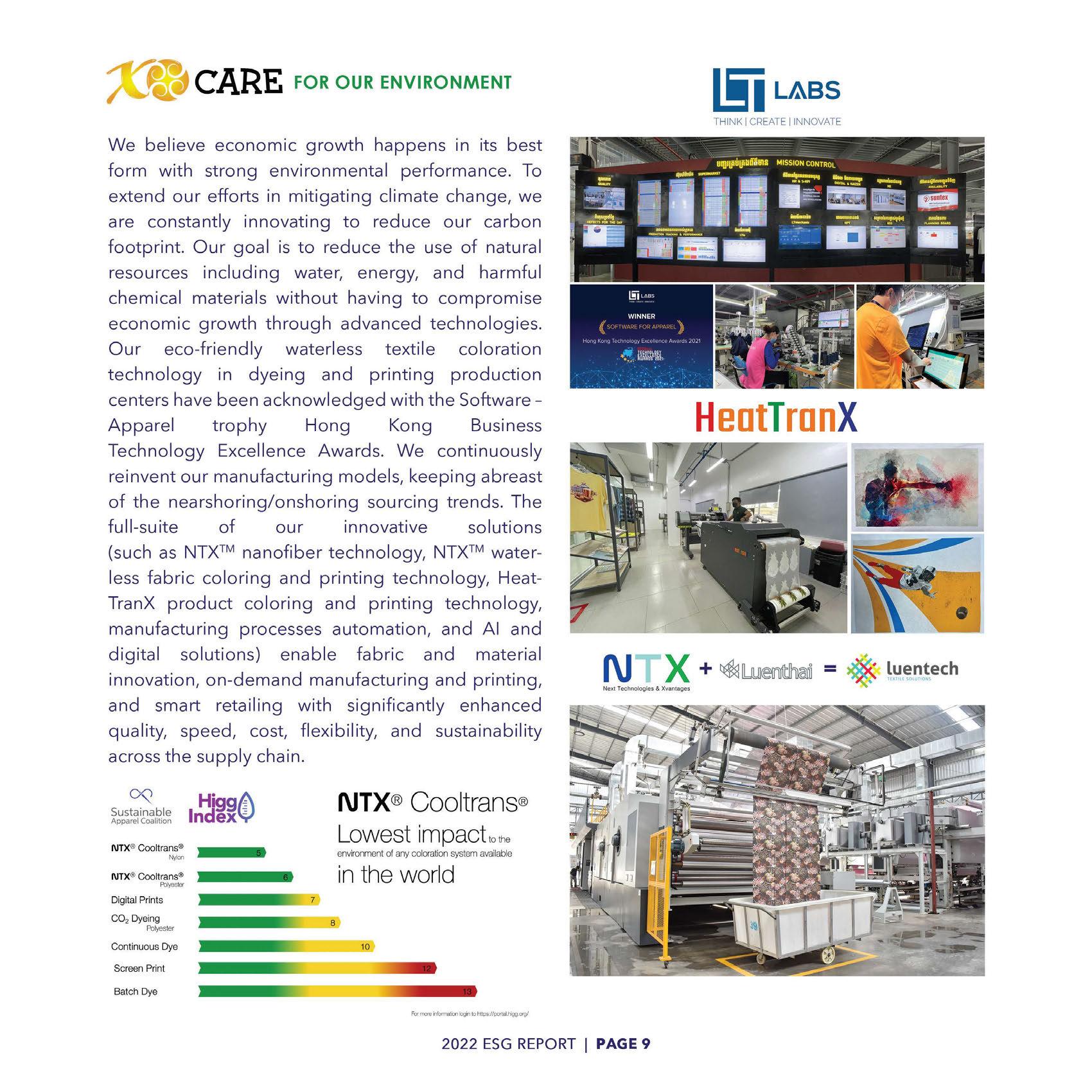 We believe economic growth happens in its best form with strong environmental performance. To extend our efforts in mitigating climate change, we are constantly innovating to reduce our carbon footprint. Our goal is to reduce the use of natural resources including water, energy, and harmful chemical materials without having to compromise economic growth through advanced technologies. Our eco-friendly waterless textile coloration technology in dyeing and printing production centers have been acknowledged with the SoftwareApparel trophy Hong Kong Business Technology Excellence Awards. We continuously reinvent our manufacturing models, keeping abreast of the nearshoring/onshoring sourcing trends. The full-suite of our innovative solutions (such as NTX™ nanofiber technology, NTX™ waterless fabric coloring and printing technology, HeatTranX product coloring and printing technology, manufacturing processes automation, and Al and digital solutions) enable fabric and material innovation, on-demand manufacturing and printing, and smart retailing with significantly enhanced quality, speed, cost, flexibility, and sustainability across the supply chain.