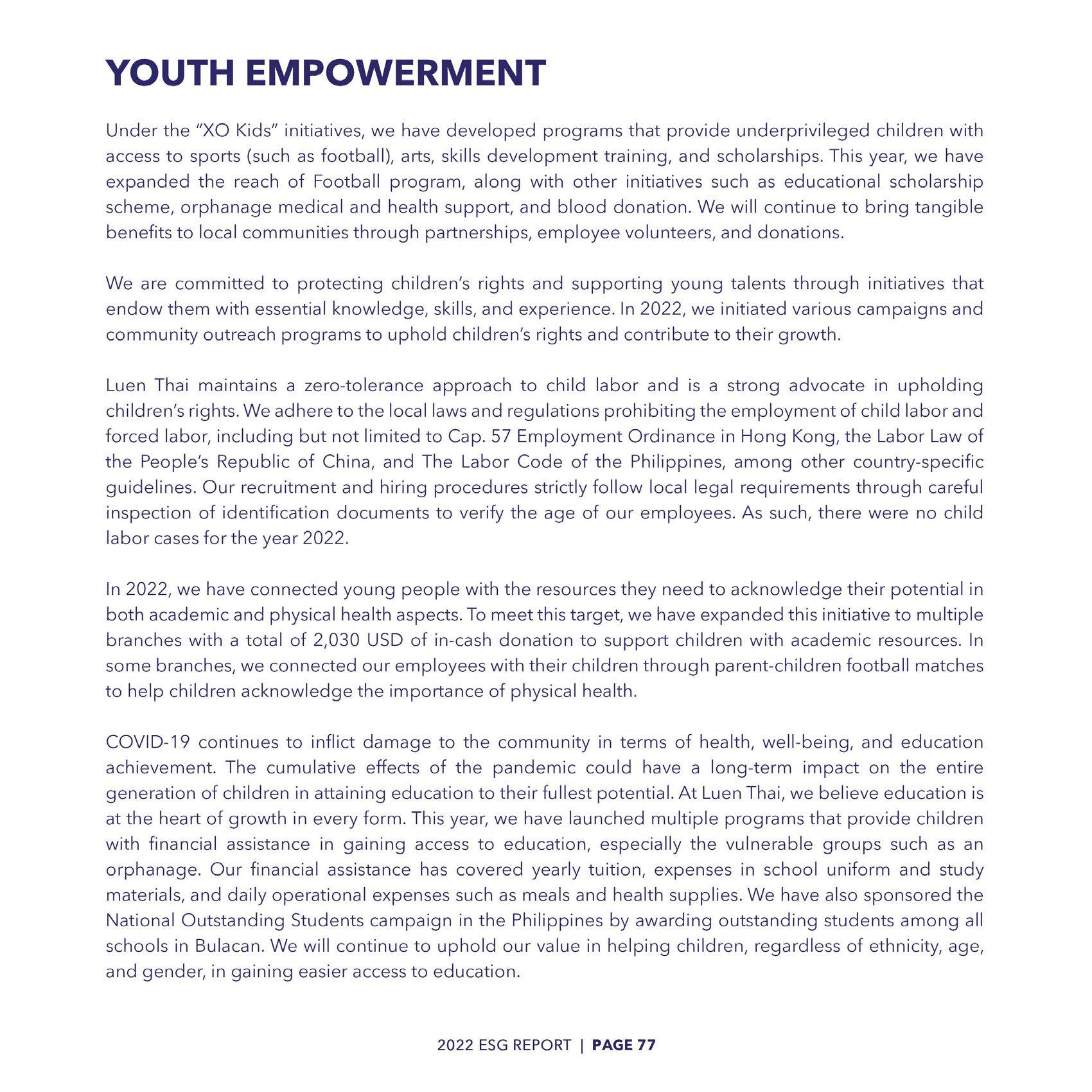 In 2022, we have launched various Football Club initiatives for children across nations to attain essential skills including physical fitness, leadership, teamwork, and well-being. Kick It Heart (1=..@t±) is our key football charity partner. Luen Thai supports the charity in different countries and regions (China, Hong Kong, the Philippines, and Cambodia) through partnerships with various organizations and clubs (Chelsea Soccer School in Hong Kong, Tuloy Football Club, XO United Football Club, and Northern Mariana Islands Football Association) with an ultimate goal to enable children to learn football, set clear objectives and plans for partIcIpants to develop physical, mental, and emotional growth. I am filled with pride as I reflect on the incredible accomplishments that we have made to improve the lives of the children we have supported over the years. Many of our football club players have been included to play in elite teams such as Philippines Senior National Team, Philippines Football League, U16 and U19 Boys Philippines National Team, U18 Girls Philippines National Team, and Philippines First Futsal National Team.