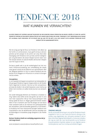 Net als vorig jaar ligt de focus van Tendence niet alleen op het herfst- en winterseizoen, maar geeft de beurs ook een preview op het voorjaar en de zomer van 2019. Door deze toevoeging richt Tendence zich op twee soorten doelgroepen: de grote ketens die alvast inkopen kunnen doen voor het nieuwe seizoen en ook de retailers die kunnen inkopen voor het najaar en kerst. De beurs speelt ook in op dé marketingtool van het moment: Influencer-marketing; een ontwikkeling die steeds meer gezien wordt als de toekomst van veel bedrijven. Met het 'BlogUps'-platform in hal 11.0 neemt Tendence een leidende rol om bloggers en influencers in contact te brengen met de retailer. Conceptstore In 2017 speelde het begrip ‘conceptstore’ een belangrijke rol. Dit jaar gaat Tendence nog een stapje verder om de retailer hierin tegemoet te komen. Hoe kun je het conceptstoreprincipe als retailer in de winkel toepassen, waar moet je op letten met inrichten en welke trends kunnen we verwachten? Een ander belangrijk element van Tendence is Outdoor Living. Tijdens deze editie zal de area groter zijn dan in 2017 met meer exposanten. Wil je meer kassa-aankopen? Ook hierop speelt de beurs in. Negen gerenommeerde merken laten in hal 11 manieren zien hoe het design van een kassa meer aandacht trekt en de interesse tot aankoopintenties kan veranderen. Zoals de bezoeker gewend is, is de Tendence Academy met haar interessante lezingen wederom een inspiratiebron voor de detailhandel. Ook een bezoekje aan de behendige en innovatieve jonge designers is de moeite waard. Kortom, Tendence biedt een veelzijdig programma dat je niet mag missen! meer informatie www.tendence.messefrankfurt.com