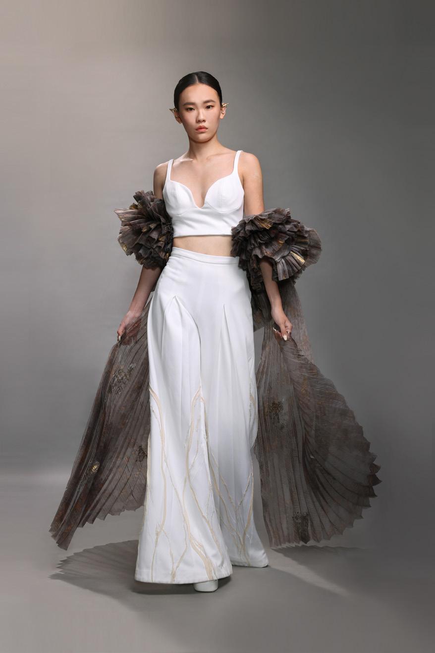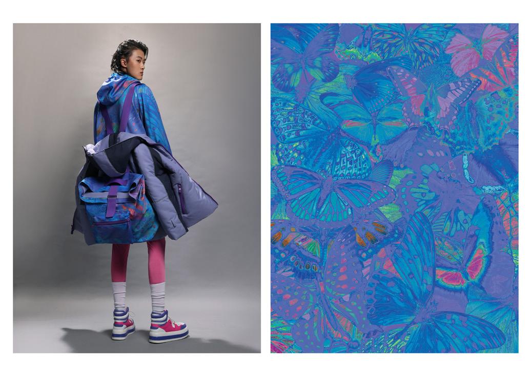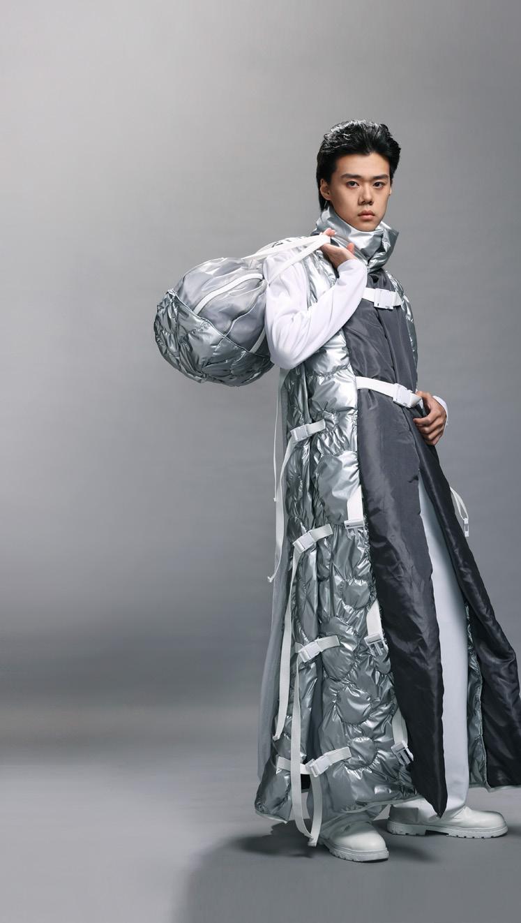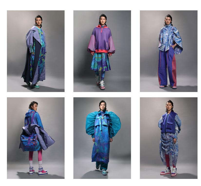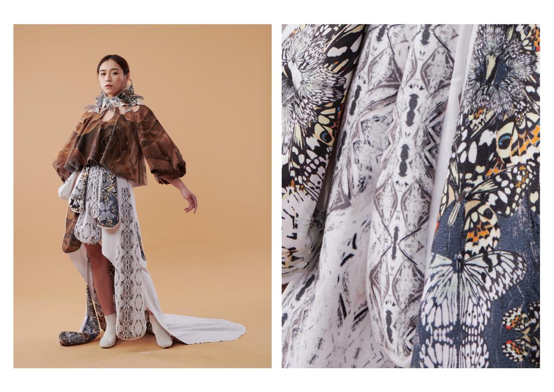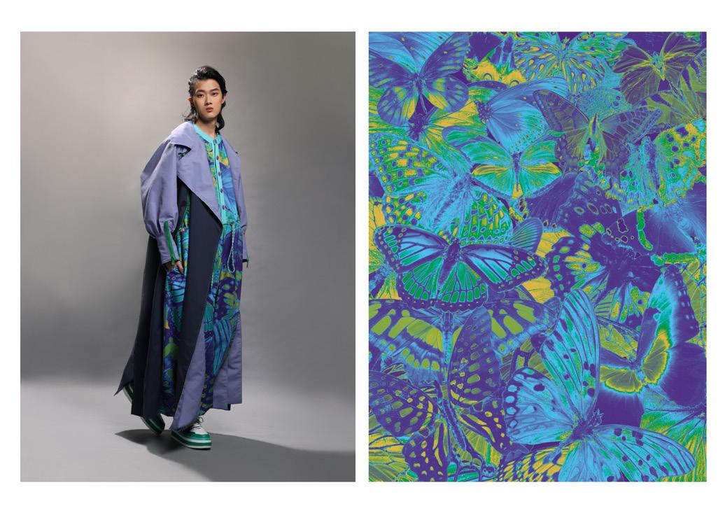 使用抽繩和織帶元素傳達蛻變之意象,無性別服裝廓形結合機能可拆解式袋包設 計,色彩斑斕的蝴蝶印花表達無懼他人眼光,破繭重生。