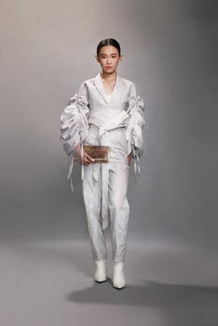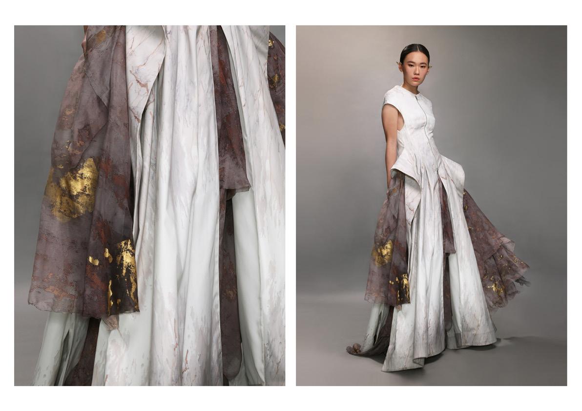 In the poem, osmanthus is not as eye-catching as other famous flowers, but it is memorable with its unique posture. The outline of this collection echoes the impression of sweet-scented osmanthus in the poem. The texture of osmanthus was deconstructed for making prints and handmade fabrics. The extended image tells the journey of finding oneself. Irregular gold leaves represent a serious and precious appearance in life. It is not perfect, but it is shiny.