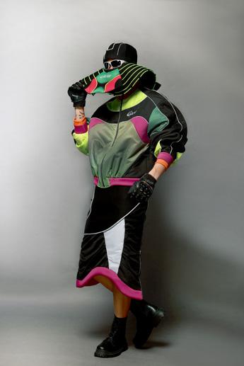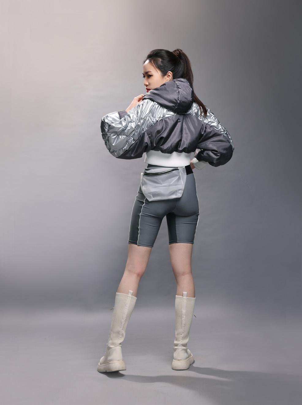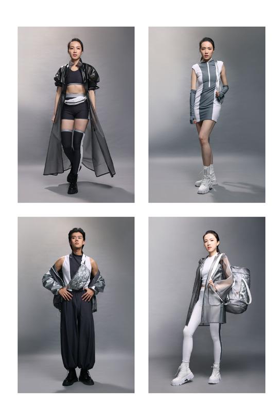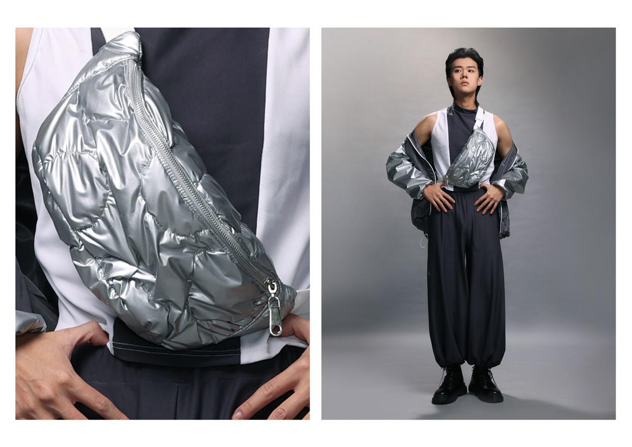 利用機能彈性布的材質來表現出運動感,佩包也以運動感的形象來設計, 整體作品風格以運動、未來感來呈現。