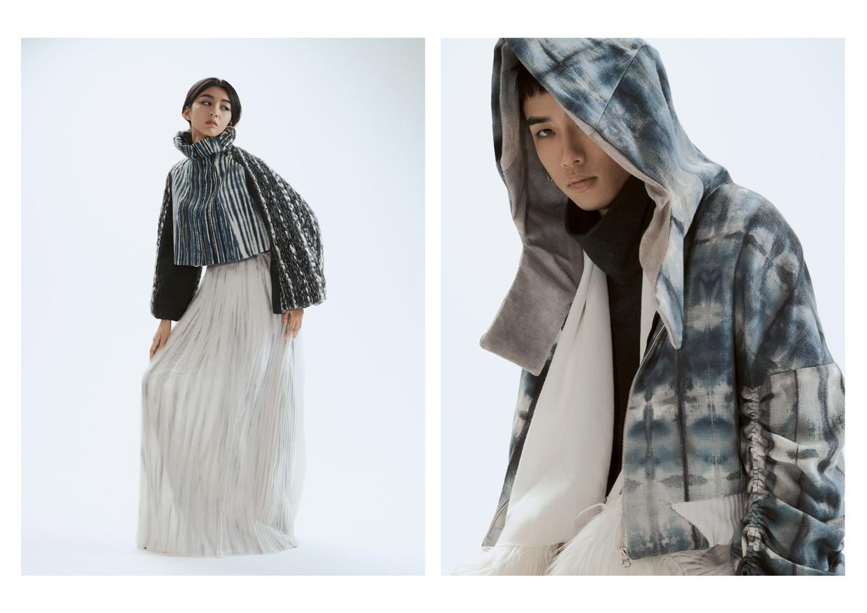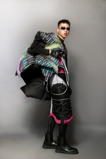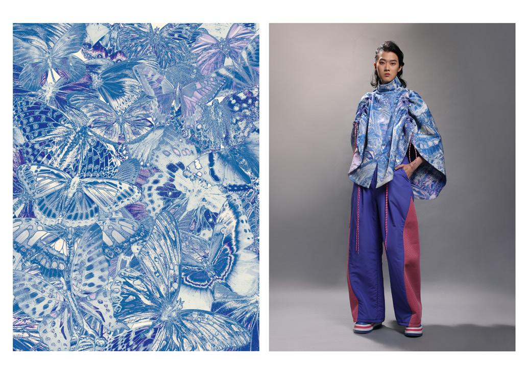 Draw strings and trims were used to symbolize metamorphosis. The unisex silhouette was combined with detachable bags. The colorful butterfly prints mean not afraid of other’s opinion and to break through for a new life.