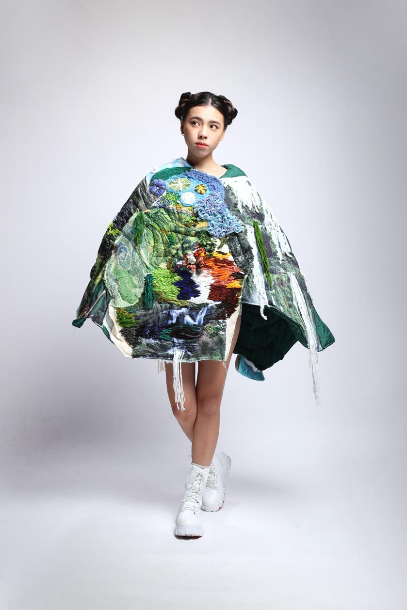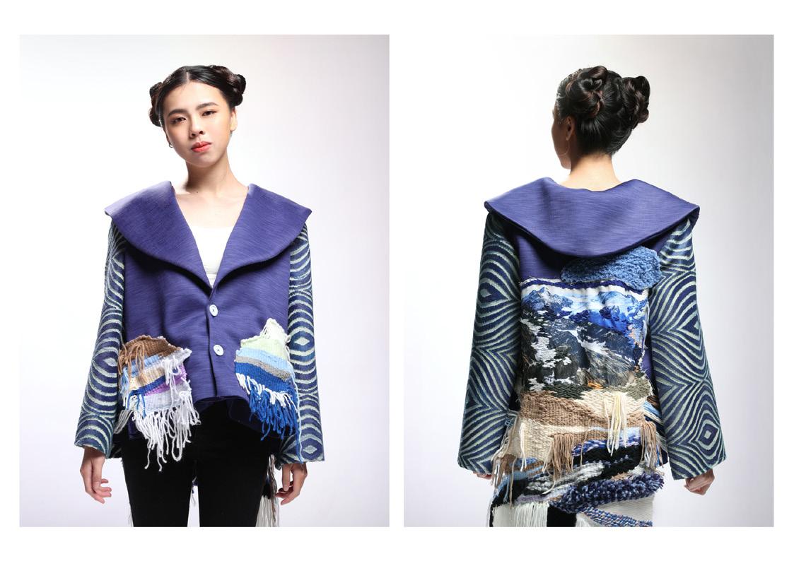 Combining fiber art with photography, this collection presents fashion with three-dimensional scenic views. The delicate weaving techniques and multiple color combinations show the unique features of the mother nature. The traditional embroidery brings out the lively marine animals. The scenery used in this collection blends people into the nature, shows the beauty of the ecology sincerely, and is meant to awaken the attention towards environmental conservation and marine ecological resources.