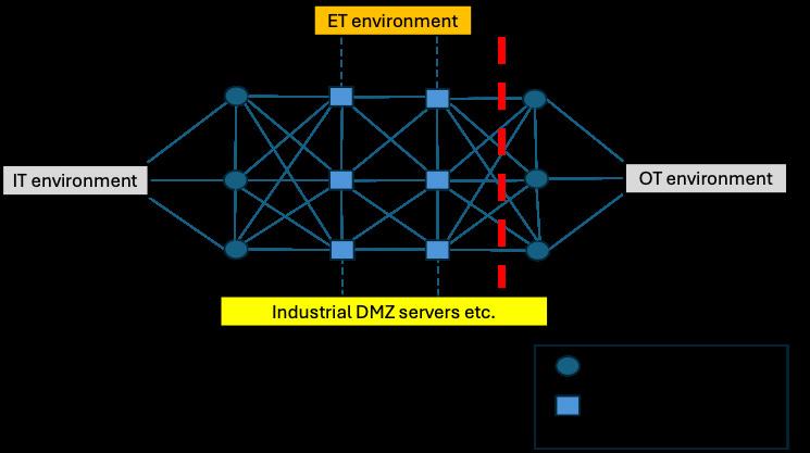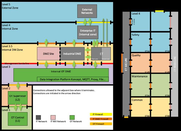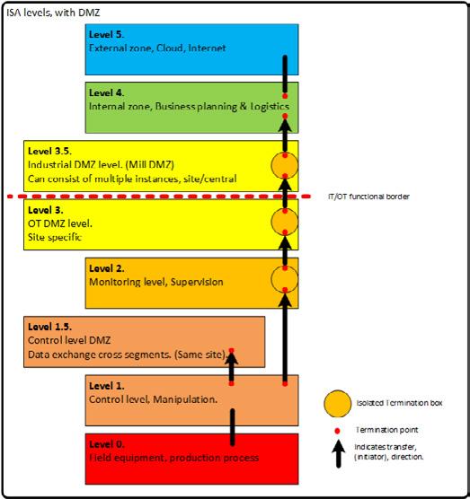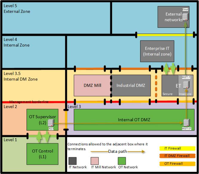 The “higher” up a system is, the more security there needs to be. Since the system managers can reside in either IT or OT, it is usually more convenient that IT manages the Industrial DMZ (level 3.5) as in the example in Figures 1.4 and 1.5. A rule of thumb is that OT systems should terminate their data connections at level 3. If more security is needed, the ET-levels can be split into two parts, see Figure 1.4 and the secure (ETxa) and restricted (ETxb) parts. The difference is that ETxa only has connections to OnPrem-systems while ETxb can have cloud connections. Further, if deemed necessary in the OT part, a level 1.5 with an extra “control level DMZ” can be set up as an additional protective layer.