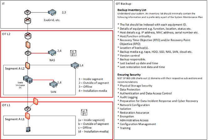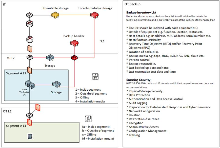 OT data are backed up adequately (applications, software/programming code, data, etc.) and backups checked and re-read/restored with OK outcome. Have backups with several levels (local, internal data centre, and external data centre)? If having virtualized OT servers - snapshots can be used for local backups