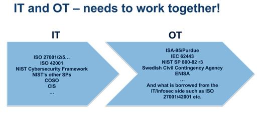The IT and OT personnel needs to work together and preferably cross-train and help out in the daily work. As can be seen in Figure 1.2, the standards used (i.e., “languages”) for to build the infrastructure and maintain these within IT and OT are most often not the same. Wanted is that the IT and OT sides jack into each other as smoothly as possible and the security level achieved is not lower than wanted to create new vulnerabilities. Thus, this requires that IT and OT work together and jointly plan for the future and manage any changes that may affect the other in a coordinated manner. Thus, to support that IT and OT work together, the ISF needs to jack
