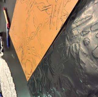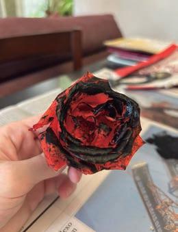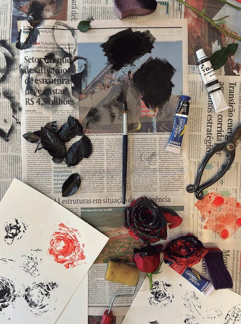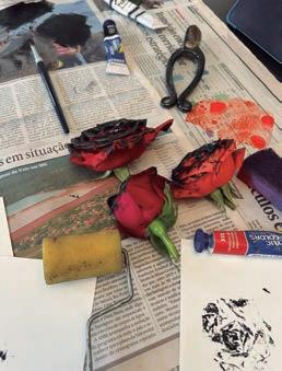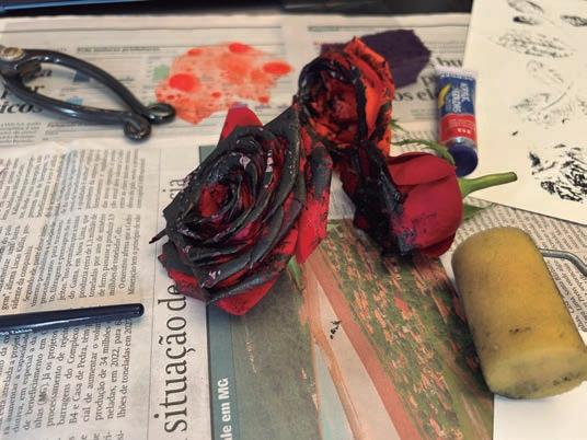 Para essa composição, foi utilizada como limitação a técnica de impressão chamada de monotipia — que consiste em criar uma impressão a partir de uma matriz que não pode ser reutilizada. Nesse caso, foram usadas rosas como matriz.