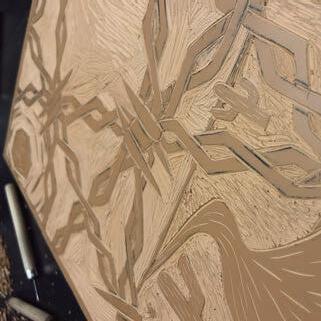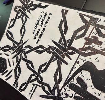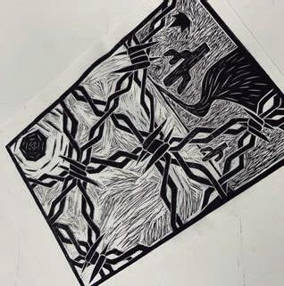 O processo se iniciou no ProCreate. Foi criada uma ilustração a partir da frase “Deus fez o mundo e o Diabo, o arame farpado”, utilizada como inspiração. Após finalizado, o desenho foi impresso e transferido para uma placa de linóleo, dando início ao processo de xilogravura. Uma vez colocado na matriz, era a vez começar o entalhamento do linóleo. O processo, apesar de um pouco demorado, foi relaxante e gratificante. As impressões feitas, após a matriz pronta, foram aplicadas em diferentes papeis com texturas e gramaturas variadas. Para finalizar, as impressões foram escaneadas e as informações, como título e elenco, foram aplicadas digitalmente.