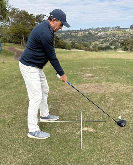Coloque a bola logo dentro do pé da frente (pé esquerdo para destros). Isso permite que o taco acerte a bola em movimento ascendente, ideal para alcançar a maior distância possível.