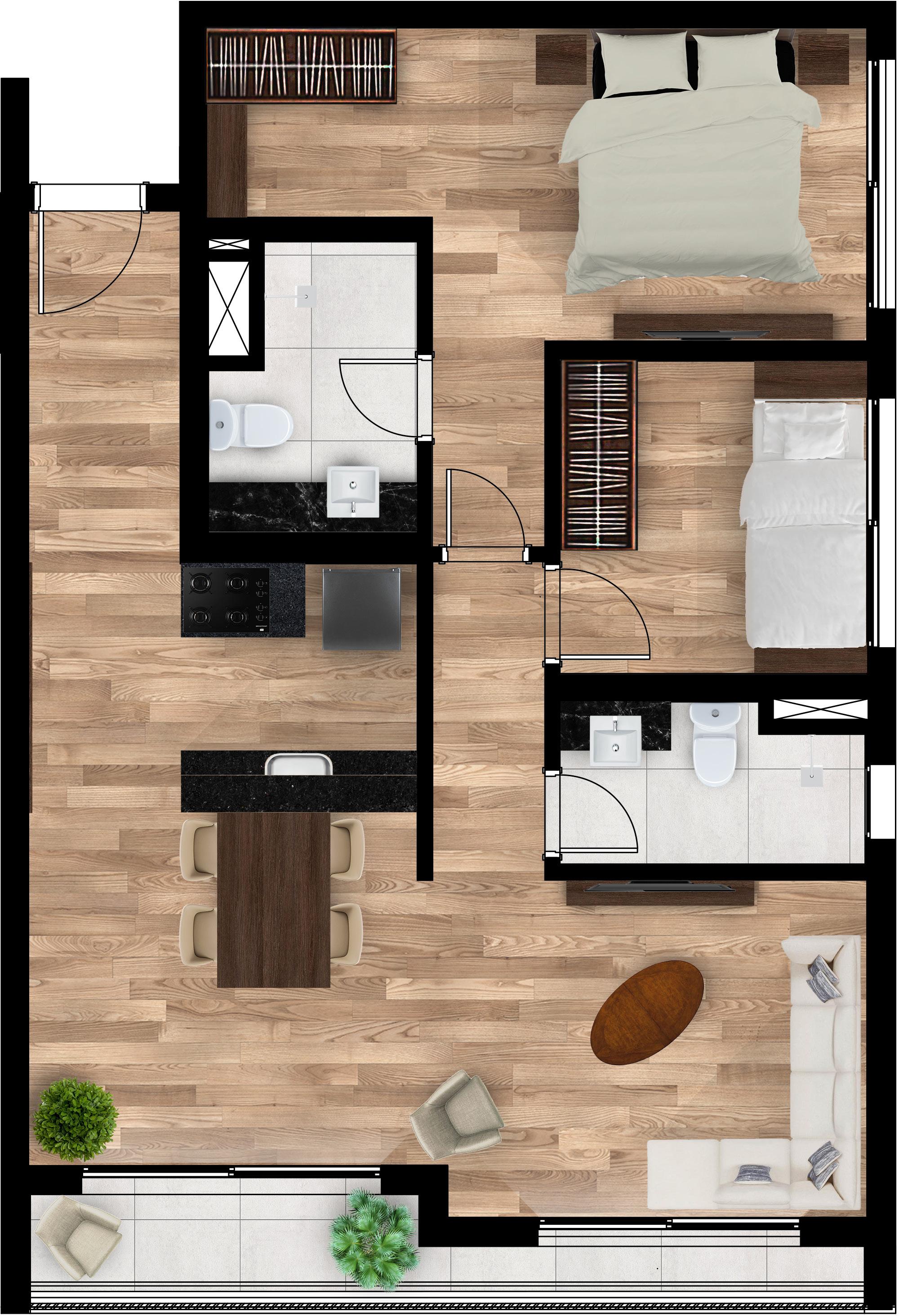 Paralelo ao detalhamento, porém para facilitar a compreeção e mimese do cliente , as plantas humanizadas , assim como os renders internos, propõem uma possibilidade de layout juntamente com uma vivência virtual ao futuro morador.