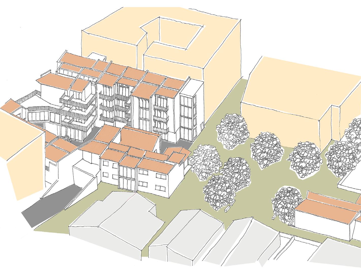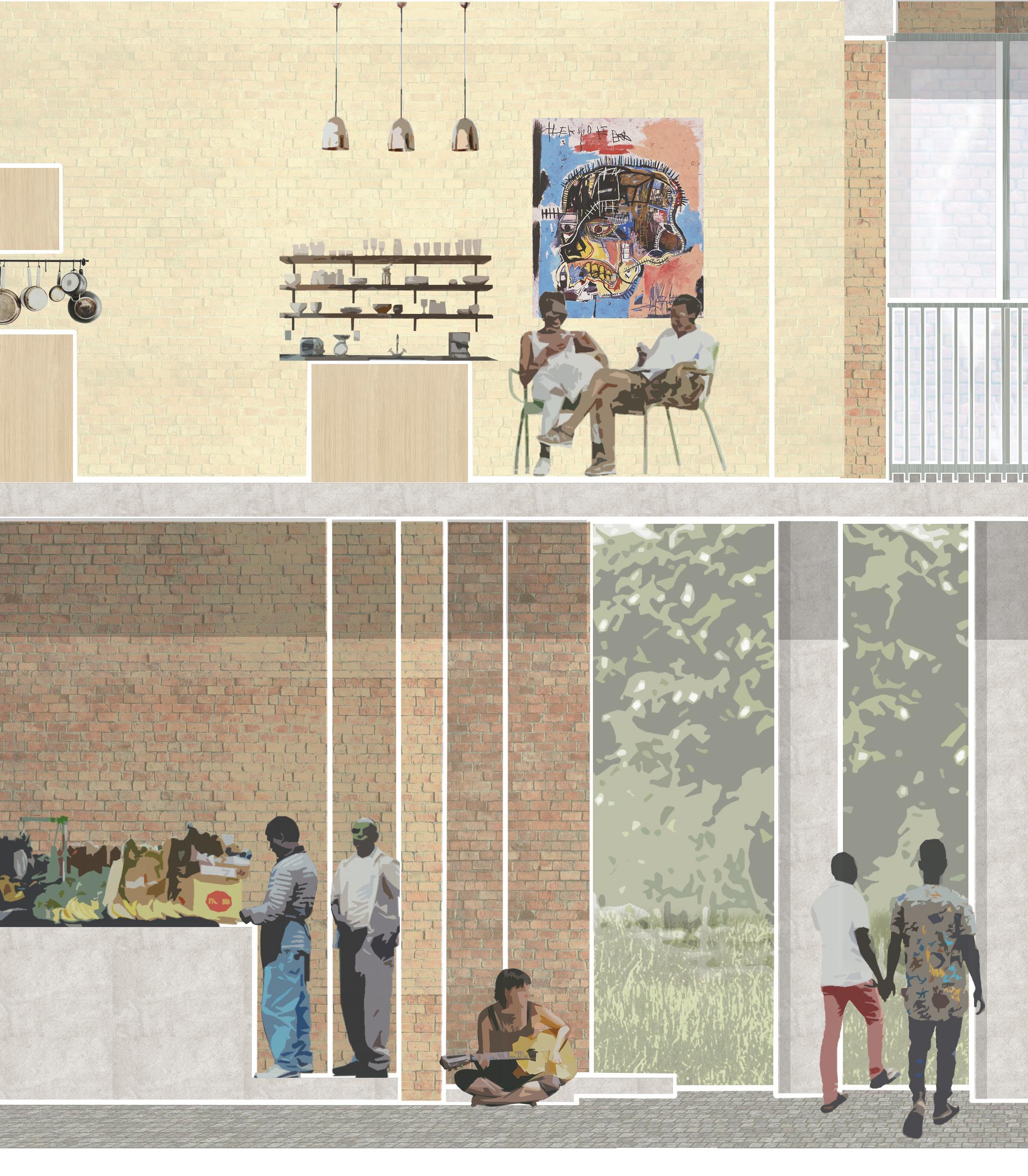 Wynberg is rapidly increasing in population and its urban fabric, along the main road is densfying due to urban redevelopment projects. My design proposal pays attention to the human scale by first gently drawing pedestrians in. My building is fragmented unlike many monolithic buildings along the road, it mimics the fragmentation of the city, with multiple interventions coexisting.