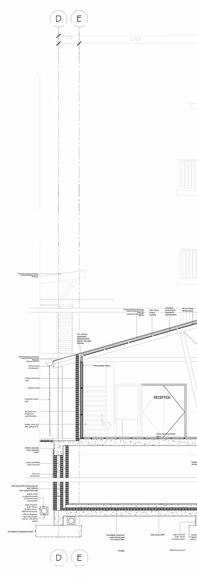 32 Reception/ records wc wc wc Store room Waiting area wc wc urinal whb whb whb whb CIRCULATION 9.9m2 Female Toilet Male Toilet Consultation Treatment Examination 16.3m2 Altro K30 or similar approved 17.4m2 16.3m2 15.9m2 Reception office ab ab ab ab ab ab ab ab ab 17080 Drainage duct whb whb 7.7m2 7.3m2 17.6m2 cpd cpd cpd RC beam over to Engineer's specification Servery counter Tread=490mm Riser =170mm W02 W02 W02 W03 W03 ab ab W04 W02/W02 2.1m high demountable timber partitions to Manufacturer's specifications 2.1m high demountable timber partitions to Manufacturer's specifications 2.1m high demountable timber partitions to Manufacturer's specifications D01 D01 D01 D01 D01 GRILL GATE D02 D02 D04 D04 D04 D01 D01 D06 D03 Bench whb (Window light= 14.2%) (Window light= 13.8%) (Window light= 13.8%) (window light=19.4%) (window light=34%) (window light=22.5%) 30m FHR 9kg CO2 fire ext. 9lt water type fire extinguisher W04 (PIPE LENGTH= 39430mm) A g g 110mm p.v.c pipe laid at 1:60 fall trh trh trh trh trh grab rail grab rail svp ramp localised ramp localised ramp localised @ ± 0.425 @ ± 0.510 1:48 fall 230 230 3540 2000 230 2640 230 11749 Shelving Shelving 626 2017 230 230 5642 230 230 10404 @ ± 0.510 W04 W04 W04 W04 ab ab ab ab ab ab ab D03 230 2640 230 1500 230 1100 230 1500 230 1970 230 1500 230 1100 230 1500 230 1710 1200 1:48 fall W01 W01 W01 W01 by the Architect Altro K30 or similar approved by the Architect Altro K30 or similar approved by the Architect Altro K30 or similar approved by the Architect 17.4m2 (window light=19.4%) Altro K30 or similar approved by the Architect Altro K30 or similar approved by the Architect Altro K30 or similar approved by the Architect Altro K30 or similar approved by the Architect Altro K30 or similar approved by the Architect Altro K30 or similar approved by the Architect 2642 230 115 1085 230 877 115 1000 50 1000 50 1000 50 1500 230 RC beam over to Engineer's specification 230 230 2834 230 2833 230 2833 230 3000 115 2000 230 A 1200 115 3310 230 3000 230 230 6150 230 3000 230 795 10405 230 2413 230 1200 115 877 230 230 230 4650 E A B C D F 23080 1 2100 DO5 D02 W05 FLOOR PLAN(743m2) SCALE: 1:100 D02 1 2 3 4 5 6 7 8 9 15 1500 1500 1500 1500 1500 1500 1500 1500 1500 10 11 12 13 14 16 1500 1500 1500 1500 1500 1500 2 3 4 5 6 7 8 9 15 10 11 12 13 14 16 1500 1500 1500 1500 1500 1500 1500 1500 1500 1500 1500 1500 1500 1500 1500 G H E A B C D F G H 1500 1500 1500 1500 1500 1500 1500 1500 1500 1500 1500 1500 1500 1500 SCALE: 1:100 NORTH EAST ELEVATION MEDICAL ASSOCIATION INSIGNIA N.G.L @ ± 0.000 F.F.L @ +0.140 Plaster and paint to approved colours B.O.E cill with dpc under WINDOW HEAD @+3000 Conc copping with dpc under 1 2 3 4 5 6 7 8 9 15 10 11 12 13 14 16 1500 1500 1500 1500 1500 1500 1500 1500 1500 1500 1500 1500 1500 1500 1500 SCALE: 1:100 SOUTH EAST ELEVATION SCALE: 1:100 SOUTH WEST ELEVATION N.G.L @ ± 0.000 F.F.L @ +0.140 Plaster and paint to approved colours B.O.E cill with dpc under WINDOW HEAD @ +3000 Conc copping with dpc under G.I flashing Chromadech roof sheets SCALE: 1:100 SECTION A-A Male Toilet Circulation N.G.L @ ± 0.000 F.F.L @ ± 0.140 Altro K30 wall finish to all walls or similar by the Architect B.O.E cill with dpc under dpc dpc 230x690mm conc footings 150mm rc slab on well compacted and termitised inert hardcore fill Provide 230x575mm conc footings under all 115mm walls WINDOW HEAD @ ± 2.400 WALL PLATE LEVEL @ +3.150 Conc copping with dpc under G.I flashing Chromadech roof sheets secured onto 50x50mm steel purlins @ 1200c/c max spacing on steel trusses to Structural Engineer's specifications ROOF NOTES Roof pitch 3° 6mm tapboard ceiling on 38x38mm brandering @ 400c/c max spacing Foundation depth and structural specifications to Eng.'s specifications R C ring beam to Eng.specifications 2.1m high demountable timber partitions to Manufacturer's specifications 230x690mm conc footings N.G.L @ ± 0.000 F.F.L @ +0.510 Plaster and paint to approved colours Conc copping with dpc under A B C D E F G 1500 1500 1500 1500 1500 1500 1500 H H G F E D C B A 1500 1500 1500 1500 1500 1500 1500 A B C D E F G 1500 1500 1500 1500 1500 1500 1500 H SCALE: 1:100 NORTH EAST ELEVATION MEDICAL ASSOCIATION INSIGNIA N.G.L @ ± 0.000 F.F.L @ +0.140 Plaster and paint to approved colours B.O.E cill with dpc under WINDOW HEAD @+3000 Conc copping with dpc under 1 2 3 4 5 6 7 8 9 15 10 11 12 13 14 16 1500 1500 1500 1500 1500 1500 1500 1500 1500 1500 1500 1500 1500 1500 1500 SCALE: 1:100 SOUTH EAST ELEVATION SCALE: 1:100 SOUTH WEST ELEVATION N.G.L @ ± 0.000 F.F.L @ +0.140 Plaster and paint to approved colours B.O.E cill with dpc under WINDOW HEAD @ +3000 Conc copping with dpc under G.I flashing Chromadech roof sheets SCALE: 1:100 SECTION A-A Male Toilet Circulation N.G.L @ ± 0.000 F.F.L @ ± 0.140 Altro K30 wall finish to all walls or similar by the Architect B.O.E cill with dpc under dpc dpc 230x690mm conc footings 150mm rc slab on well compacted and termitised inert hardcore fill Provide 230x575mm conc footings under all 115mm walls WINDOW HEAD @ ± 2.400 WALL PLATE LEVEL @ +3.150 Conc copping with dpc under G.I flashing Chromadech roof sheets secured onto 50x50mm steel purlins @ 1200c/c max spacing on steel trusses to Structural Engineer's specifications ROOF NOTES Roof pitch 3° 6mm tapboard ceiling on 38x38mm brandering @ 400c/c max spacing Foundation depth and structural specifications to Eng.'s specifications R C ring beam to Eng.specifications 2.1m high demountable timber partitions to Manufacturer's specifications 230x690mm conc footings N.G.L @ ± 0.000 F.F.L @ +0.510 Plaster and paint to approved colours Conc copping with dpc under A B C D E F G 1500 1500 1500 1500 1500 1500 1500 H H G F E D C B A 1500 1500 1500 1500 1500 1500 1500 A B C D E F G 1500 1500 1500 1500 1500 1500 1500 H MEDICAL ASSOCIATION INSIGNIA Plaster and to approved B.O.E cill with dpc WINDOW Conc copping dpc under 1 2 3 4 5 6 7 8 9 15 10 11 12 13 14 16 1500 1500 1500 1500 1500 1500 1500 1500