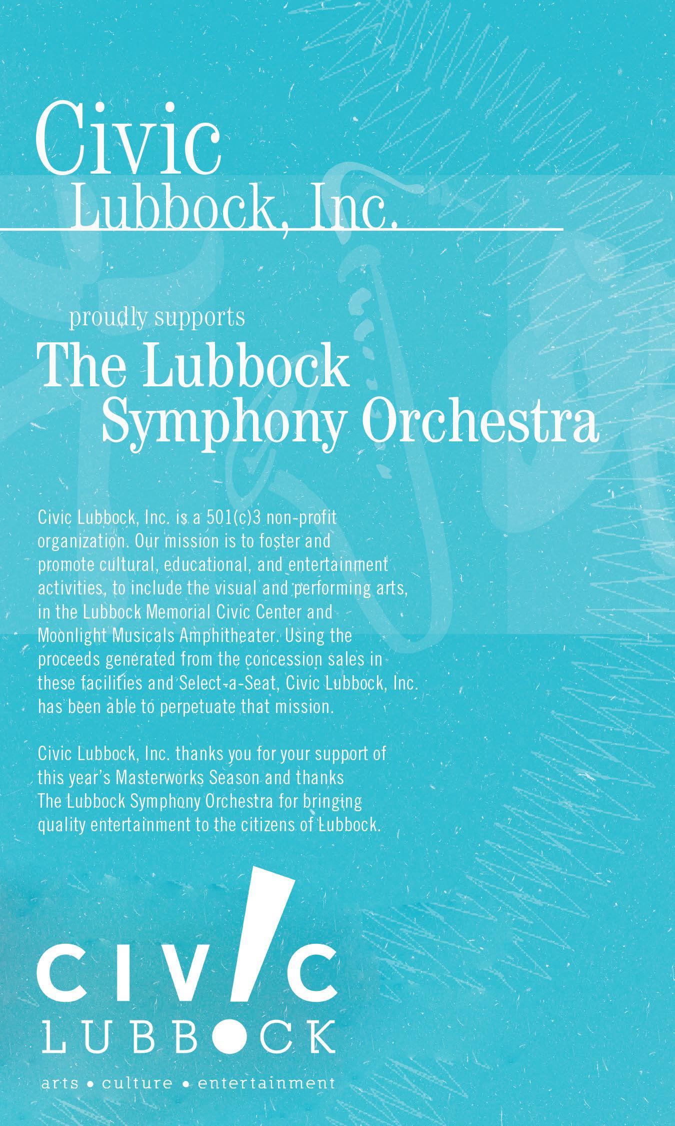 I hope you enjoy the incredible talent of our remarkable Orchestra and value the educational and cultural contributions they provide to our community. I invite you to consider becoming a member of our Lubbock Symphony Guild. For more information, please visit our website at www.LubbockSymphonyGuild.com.