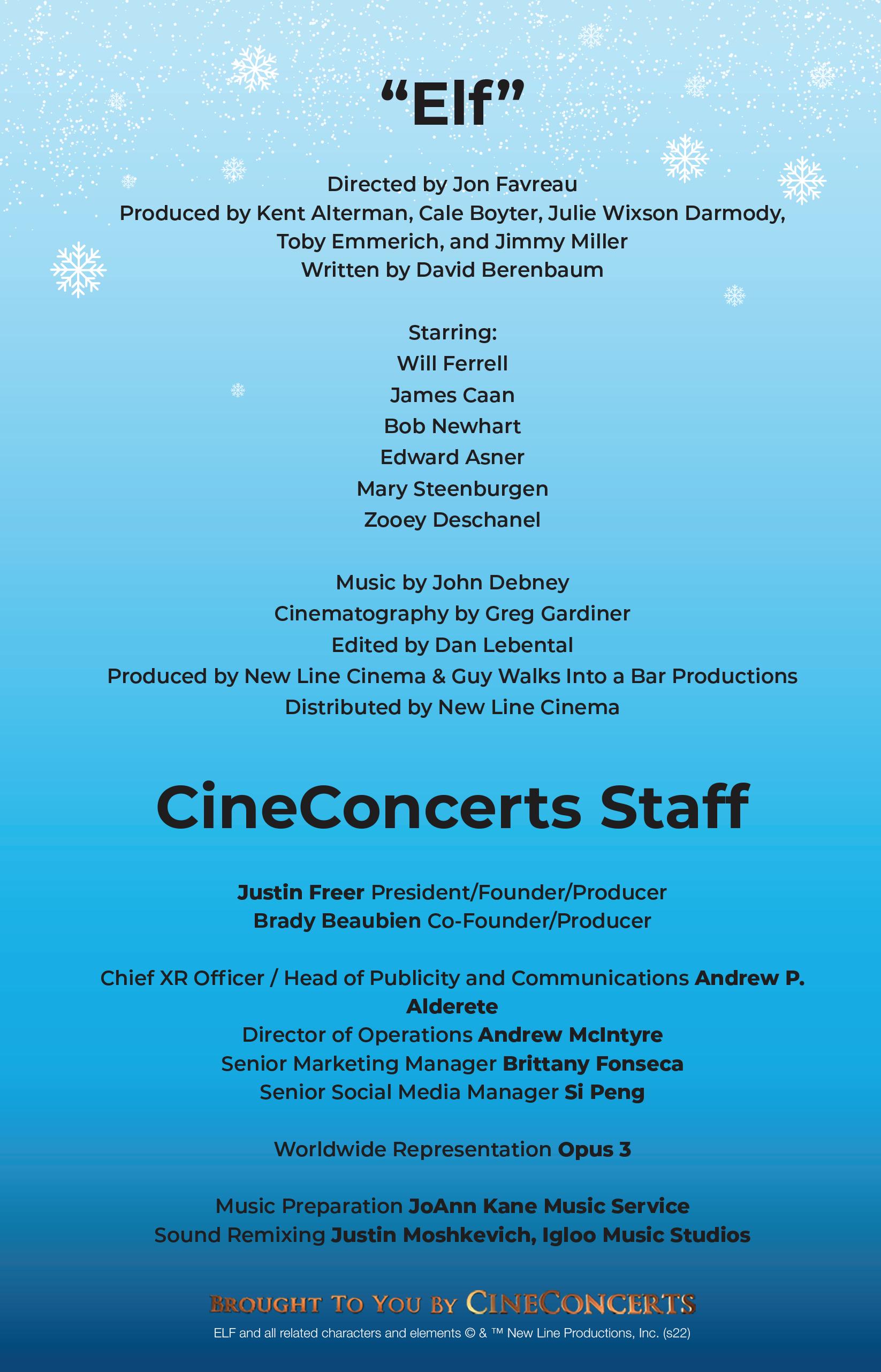 Happy Holidays and thank you for coming to “Merry Movies: Elf in Concert”! This evening’s performance is sure to bring the holiday spirit to all in attendance. Enjoy the night as the Lubbock Symphony performs live alongside the film “Elf.”