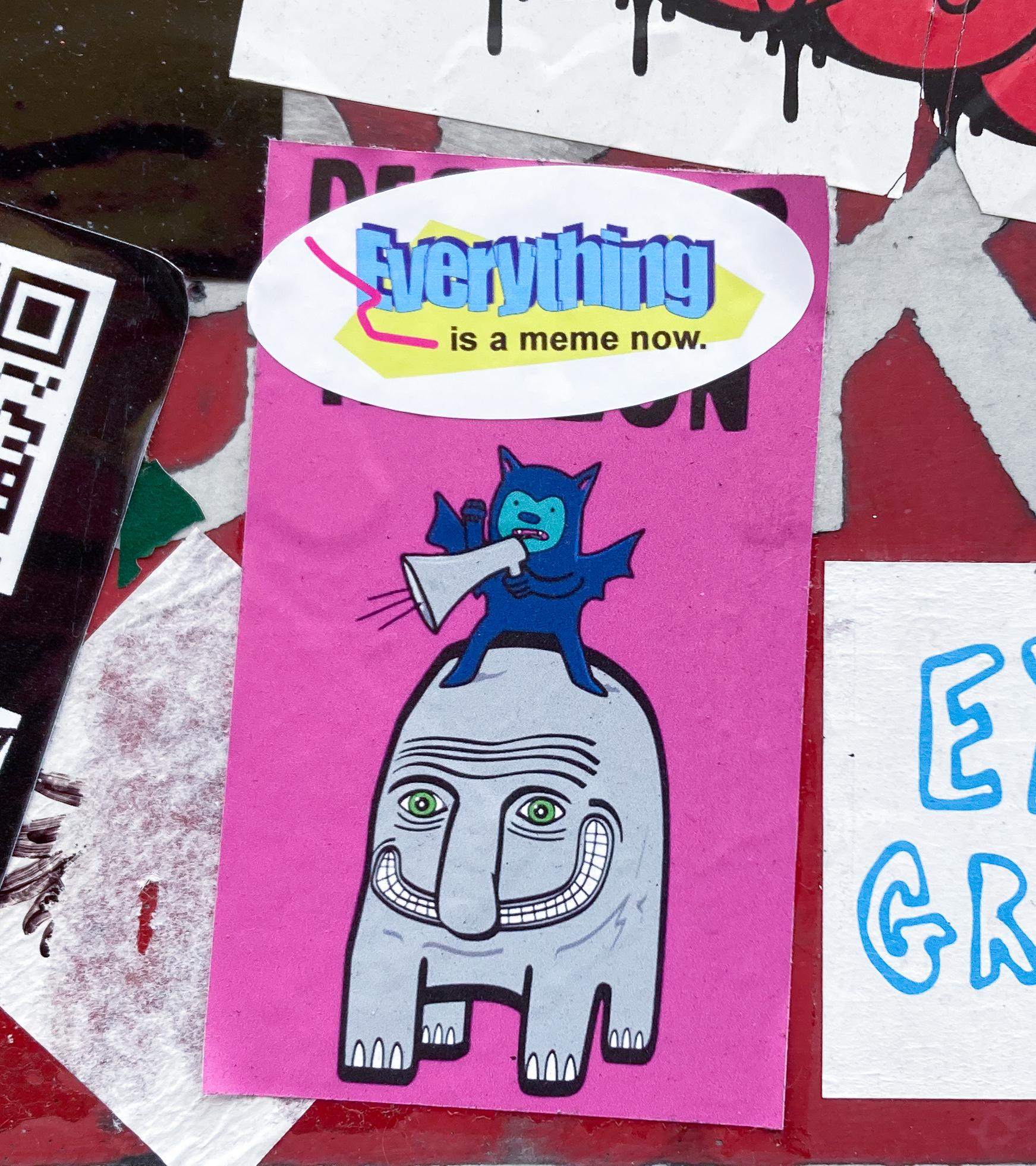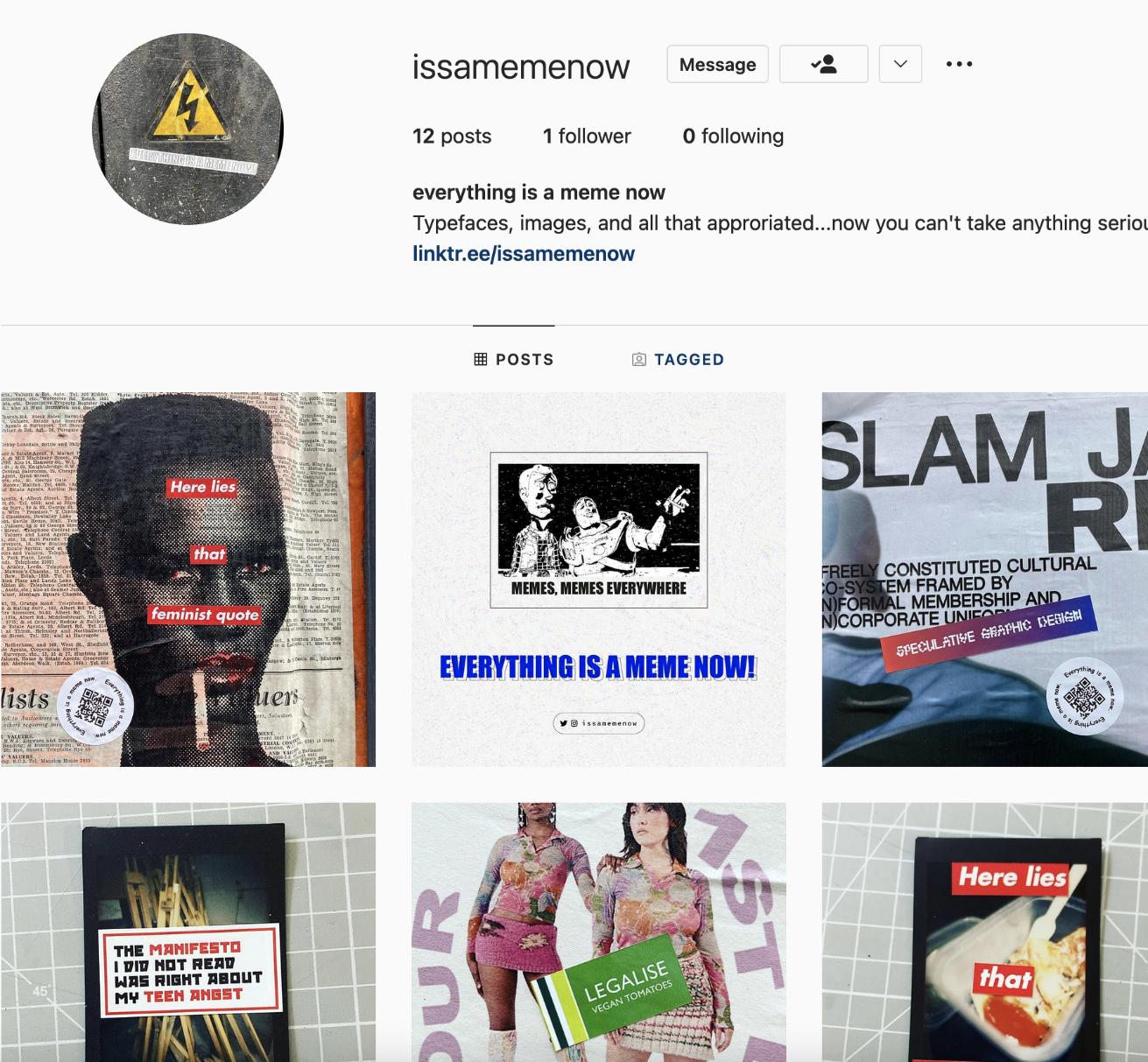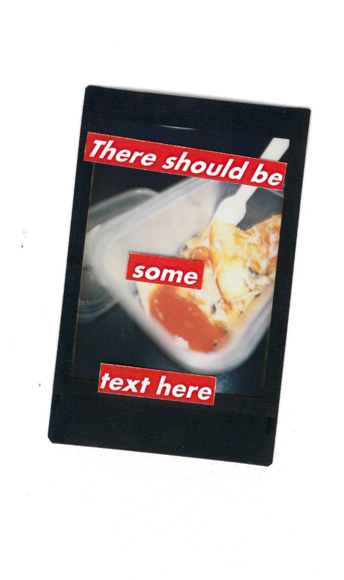 Everythingisamemenow! isabodyof workthatfeaturesbothphysicaland digitalmedia.Itprovidesalensforpeople toseeeverythingasamemeand encouragesthemtopointandlaugh withoutsuggestinganyredemptive qualities.Thevisualelementsthathave beenappropriatedduringtheprocess: typefaces,imagery,andsoon...now everythinglookslikeajoke.Andwhat aboutit?Onthedownside,wecanno longertakeanythingseriously,butonthe upside,anythingcanbefunnynow.