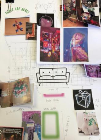 Thisisaninstallationinsideofthenightclub ZentralforitsChristmasdecoration.Iwasin chargeoftheartdirectionaswellasthe installation.Meanwhile,threeofmycolleagues helpedmewithsomeofthewoodworkand electricalworks. Drawinginspirationfromtheonline cultureofVapourwave,thissetis designedtoshowthesubversivebut funnysideofthenightclub.It integratedChristmaselementswith onlineculture,aswellastheneon lightsaestheticsofHongKong. Scanofthemood-board; photoduringinstallation THEINSTALLATIONWAS 5.1METERSWIDE,2.8METERSHIGH