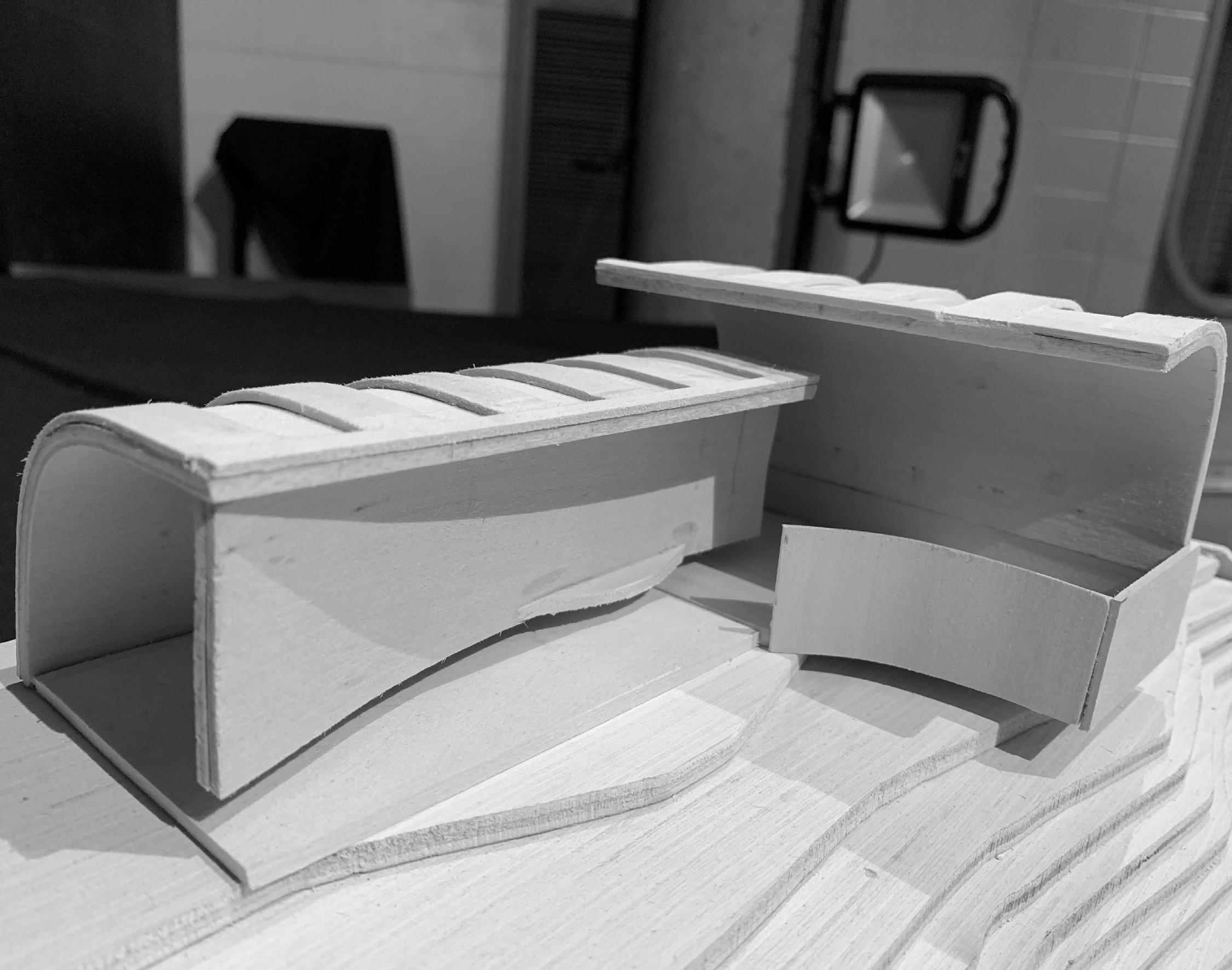 For this project I was tasked to design two follies (pavillions) on the northside of Mississippi State University’s campus. One folley resides in the sloped wooded area of the Thad Cochran Research Center, while the other folly overlooks Chadwick Lake. This was the first attempt at designing structures on an actual site. The folley overlooking the lake interacted was designed to appear as if it was floating above the lake. The curved geometry of the structure is indicative of the softness of the lake. The folley in the wooded area was designed to interact with slope of the site. Occupants circulate through the folley in a switchback fashion - like a path along a steep hill. The walls are angled up with louvers overhead to draw attention to the tree canopy. Both structures focus on understanding of how architecture interacts with the site and the user experience of space.