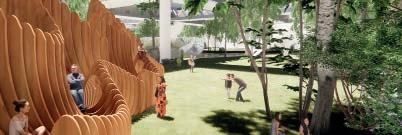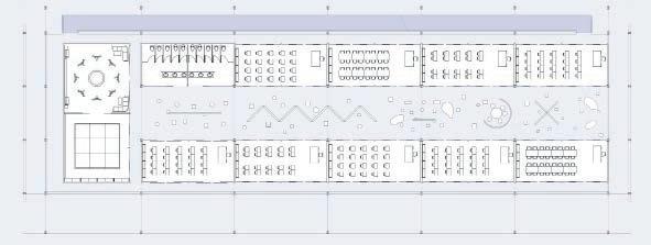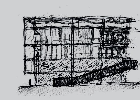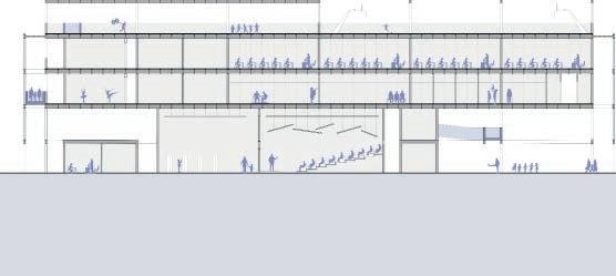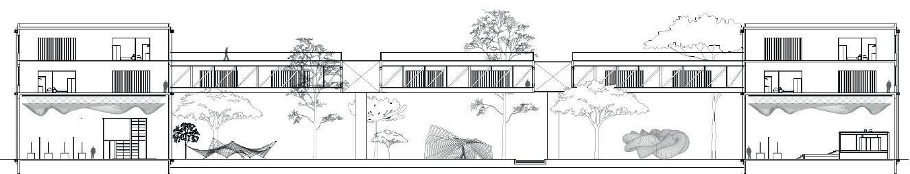 A área verde que circunda o local torna o mesmo impermeável ao caos urbano, tornando este um mundo á parte, em que nem mesmo os altos edifícios ao redor podem penetrar, uma vez que e estrutura metálica externa é coberta por malha têxtil, garantindo privacidade sem perder a circulação livre de ar entre interno-externo. Atividades esportivas invadem a cobertura, apropriando-se da ampla área aberta neste pavimento. Todo o uxo é realizado por rampas que permeiam as fachadas, levando a circulação para um espaço especí co que transita entre interior e exterior do construído.