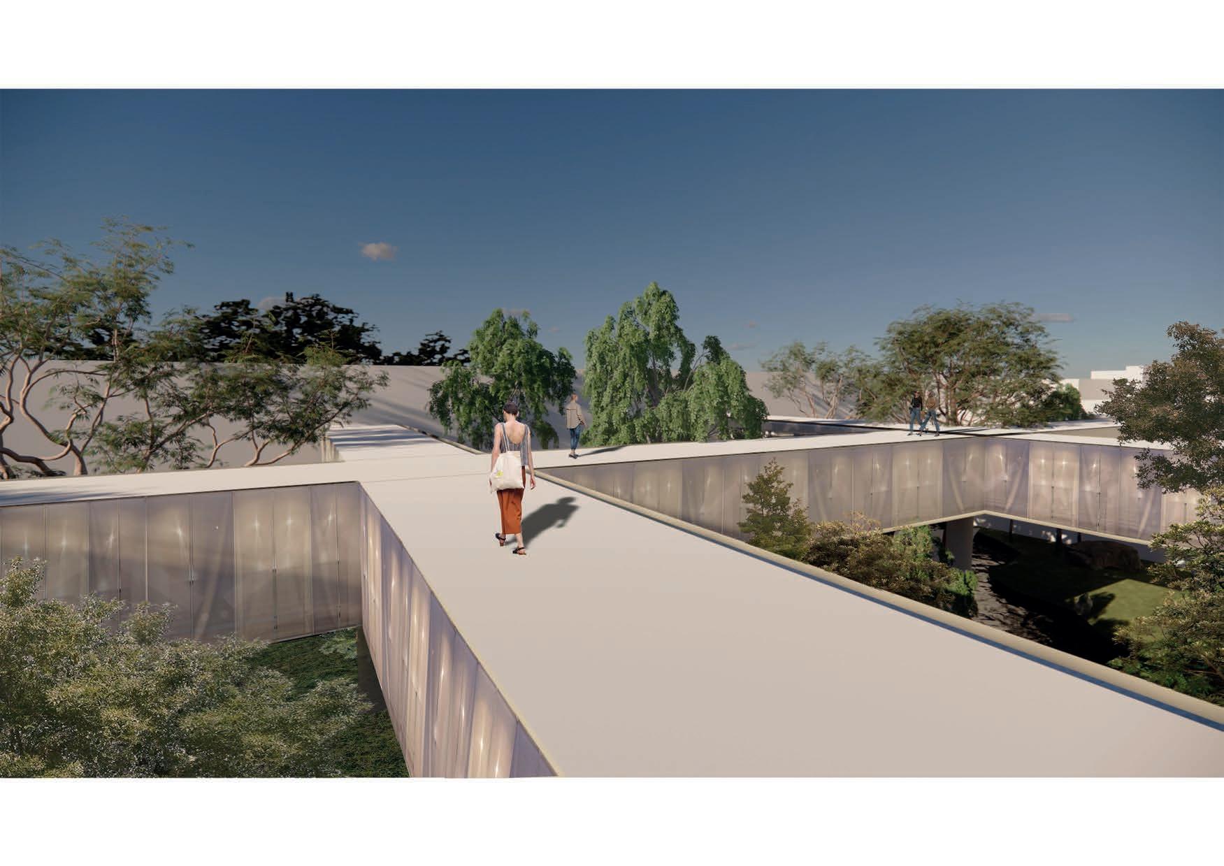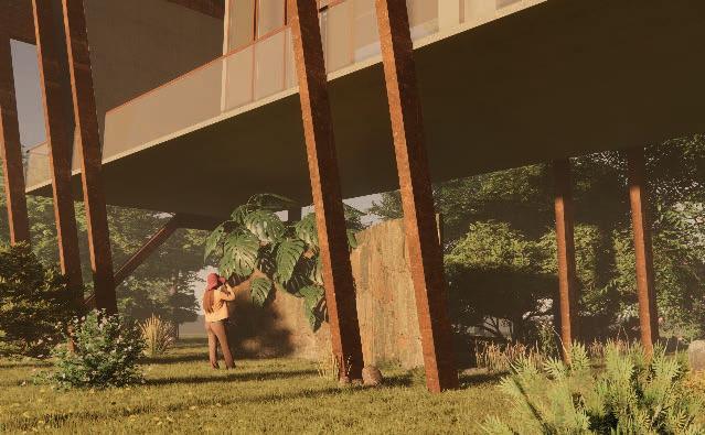 Por outro lado, a manutenção rígida do edifício impossibilitaria o uso do mesmo para o programa previsto. Foi necessário a união de pavimentos para gerar a amplitude necessária para implantação das réplicas arquitetônicas e os módulos duplex estudantis. A forma quadrada que envolve o vazio proporcionava vãos inabitados que anseiavam por reconfiguração; a partir disso projeta-se passarelas habitadas que criam uma grelha três por três que sobrevoa o pátio central do térreo. Trazendo, dessa forma, a sensação de coexistência entre indivíduo e vegetação a partir da integração de mesmo nas áreas de respiro, gerando reconforto em meio ao caos urbano.