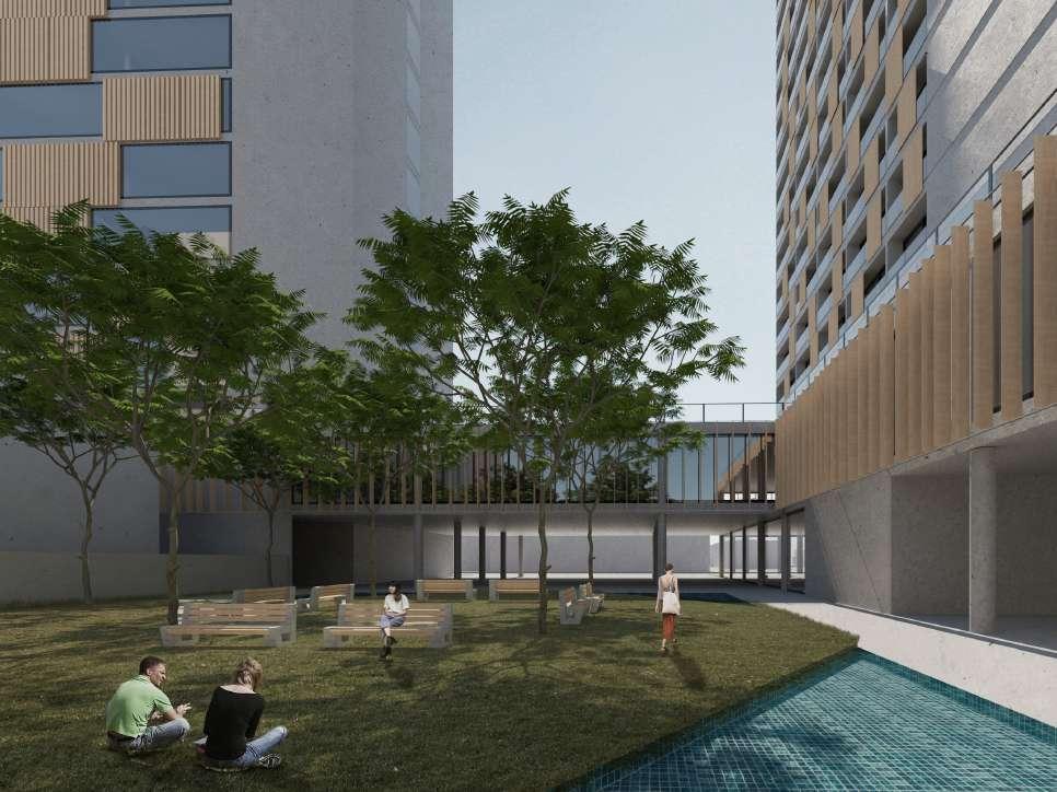 O conjunto possui dois prédios, e foi pensado para conversar com o bairro. Dessa forma, o edifício residencial dialoga com a ruas que possui mais residências e menos movimento. Já o edifício corporativo se relaciona diretamente com a avenida, onde possui mais serviços e comércios e tendo sua volumetria estabelecida pelo desenho da rua. O projeto buscou ter o mesmo diálogo visual, propondo o mesmo gabarito para os dois edifícios e trabalhando com a madeira para o fechamento de todo o complexo.