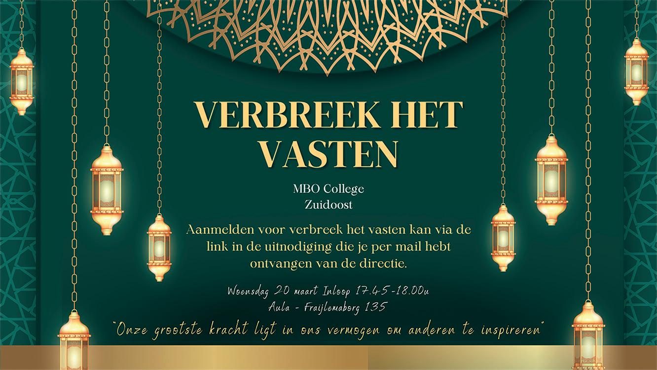 Voor het evenement ‘Verbreek het vasten’ dat plaats vond bij MBO College Zuidoost heb ik van een bestaand verticale ontwerp de opdracht gekregen om deze in narrow casting formaat om te zetten. Dit heb ik gedaan in Canva, omdat het bestaande ontwerp hier ook in was ontworpen. Desondanks ik met Canva weinig ervaring had omdat ik tijdens de opleiding ervaring heb opgebouwd met de programma’s van Adobe is het mij toch makkelijk gelukt om het