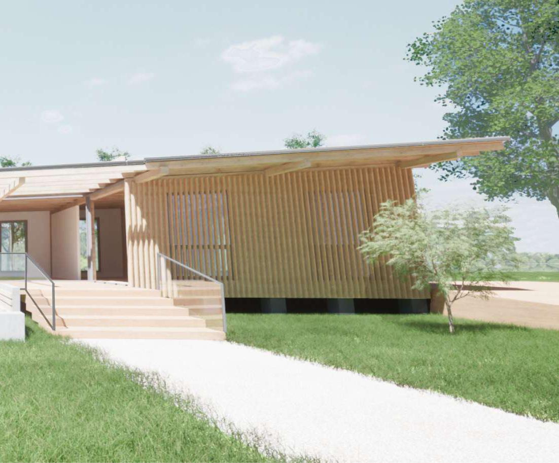 DasDesignbasierteaufgrundlegendenPrinzipiendesHolzbausmitHolzrahmenund-trägern.Deroffene GrundrissermöglichtemaximaleFlexibilität,währendgroßeGlaswändevielTageslichteinließenundeine VerbindungzurNaturherstellten.DassichtbareHolztragwerkschufeinewarmeundeinladendeAtmosphäre.