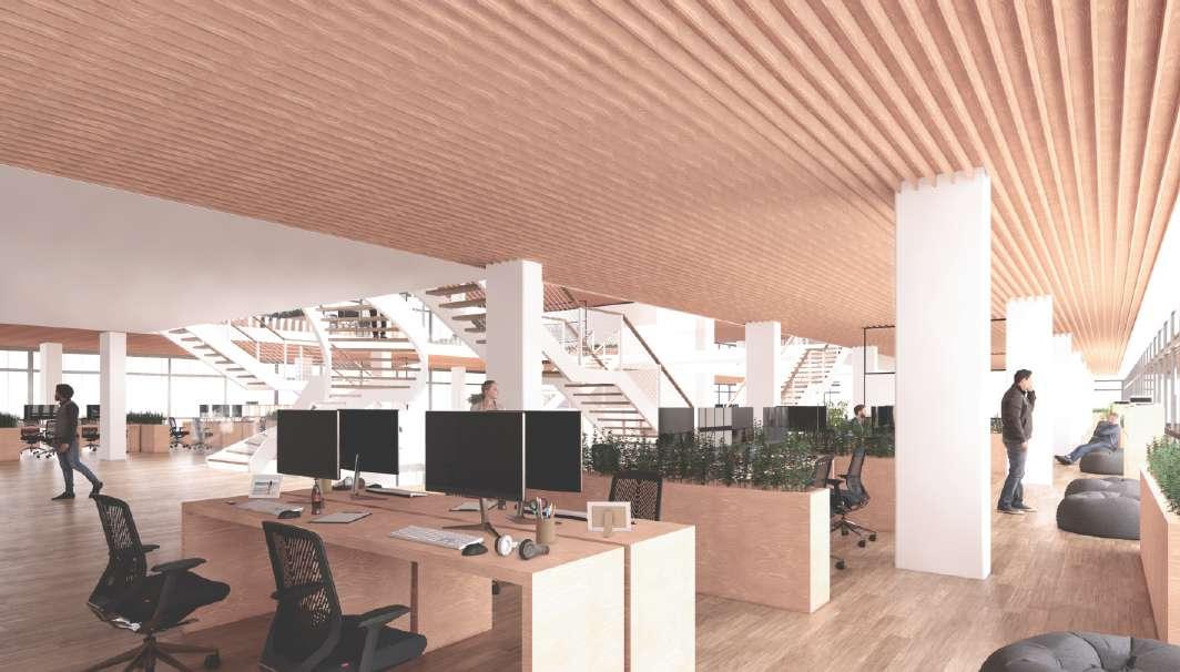 O programa compreende 30 lojas nos 2 primeiros pavimentos, 2 pavimentos open ofce com capacidade para 50 estações de trabalho, 4 salas de reunião e 2 copa cozinhas compartilhadas, 80 unidades de salas de escritório em 4 pavimentos e pro m um terraço verde.