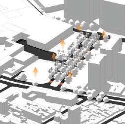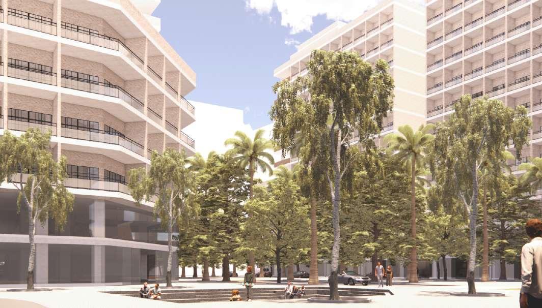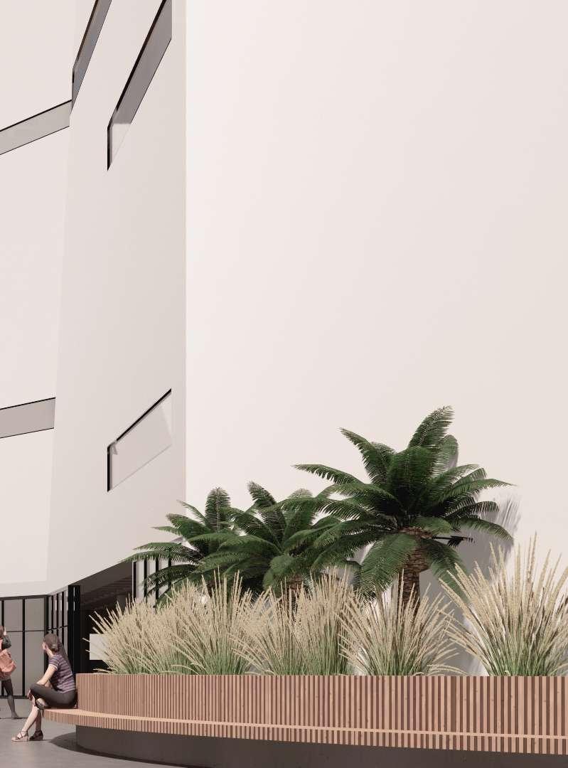 Estabelecidas as bases urbanas, desenvolve-se o projeto de arquitetura, dividido em três edicações de uso misto, mesclando comércio, serviços e habitação. Para o térreo e o segundo pavimento é proposta uma galeria comercial em cada edifício, de forma que possam estejam abertas para a rua.