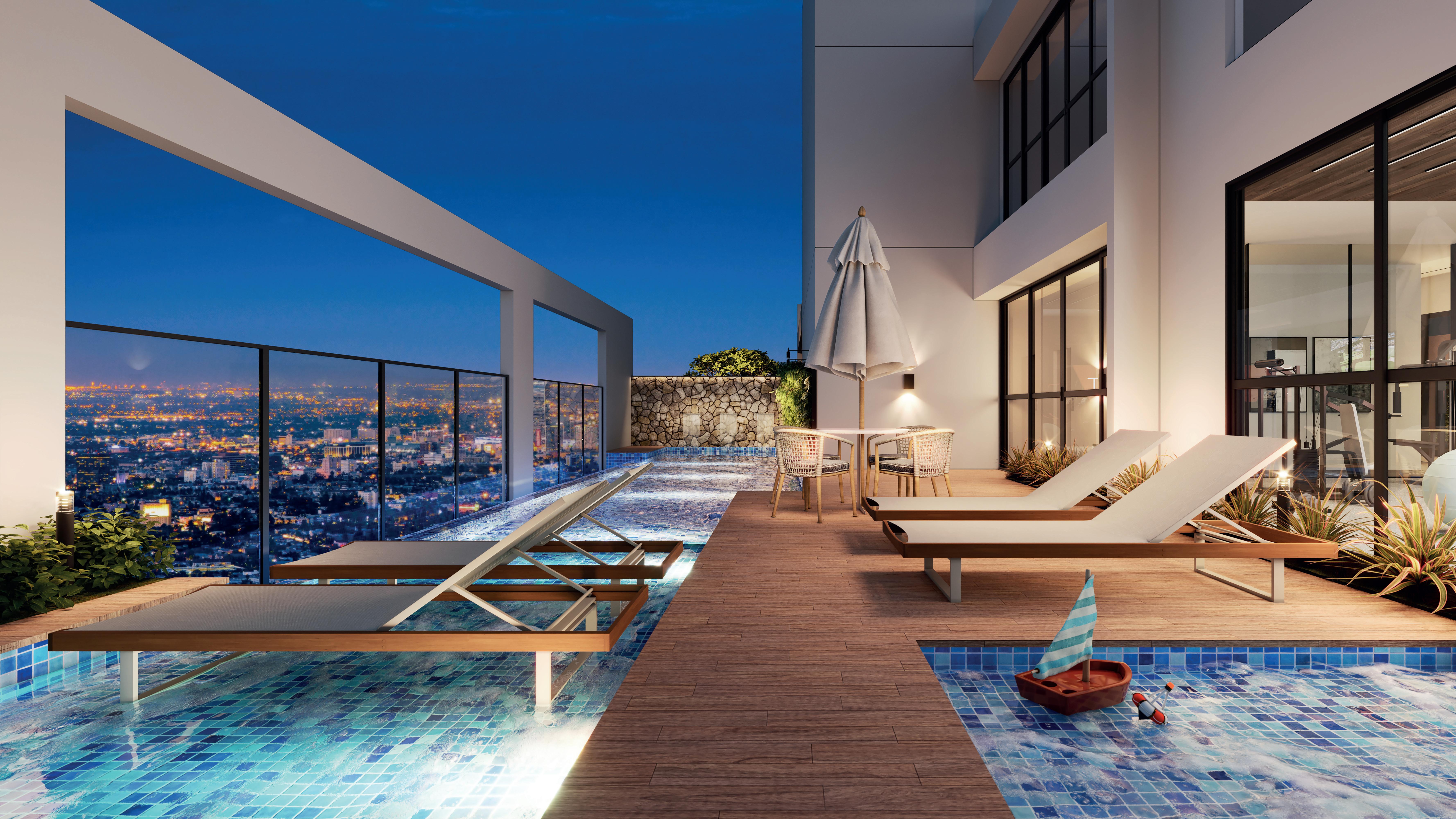 SPA aquecido de 16,69m² com vista, vegetação integrada e acesso ao SKY bar, com 6m²