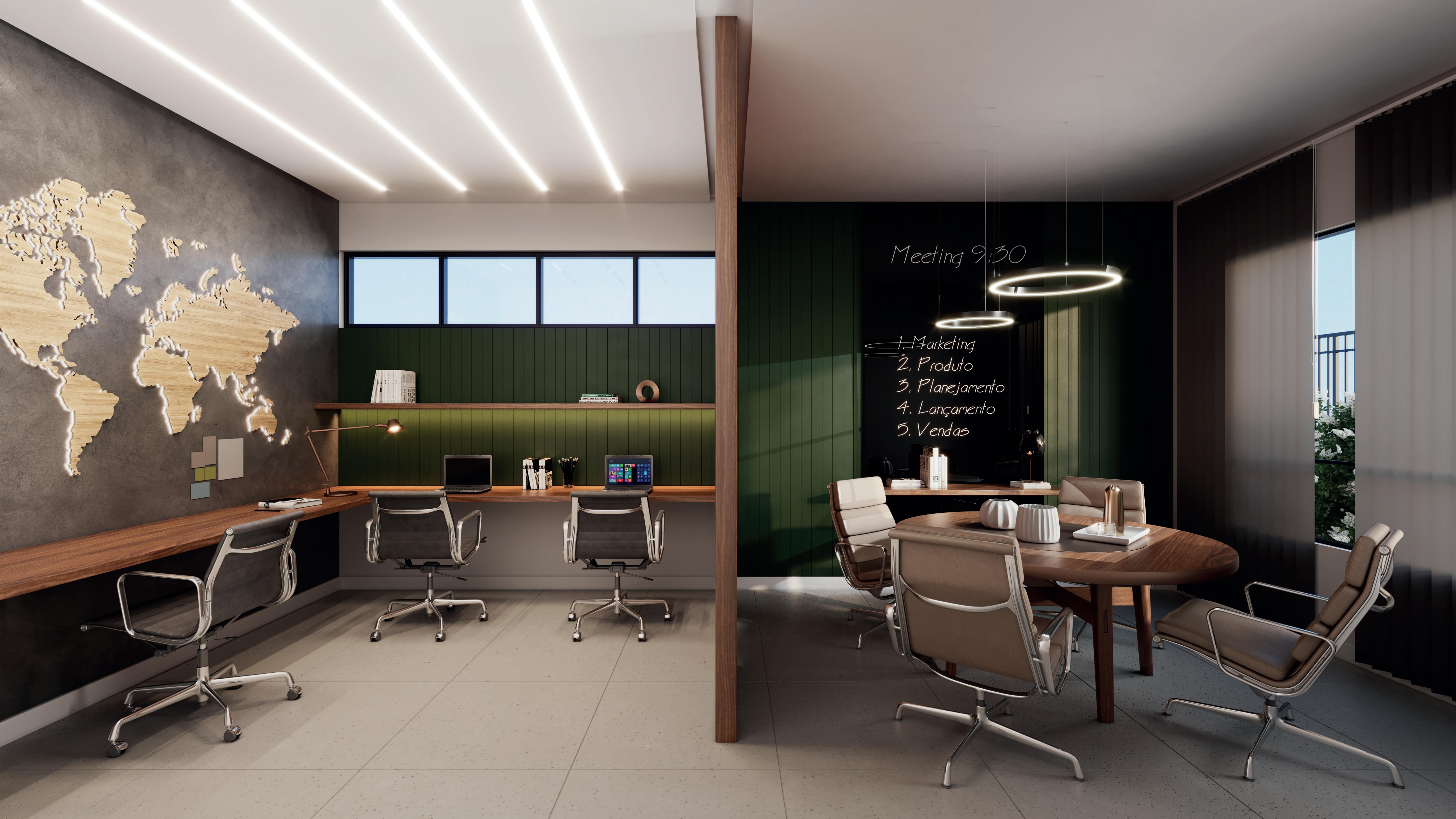 Coworking de 32,69m² com dois ambientes diferentes: Estação de trabalho e Sala de reunião separada