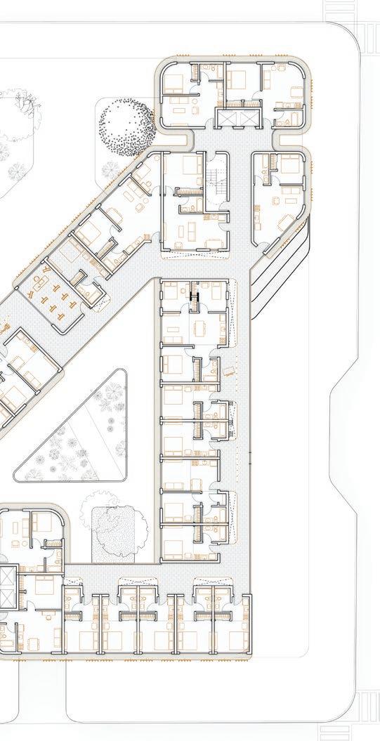 The units range from a studio to three bedrooms. Where the volume is linear, they follow typical designed layouts. In the ‘mounds’, the units become customized, changing per floor. Where there is a switch on corridor paths, the adjacent rooms become community rooms, such as art rooms, computer, and laundry rooms.