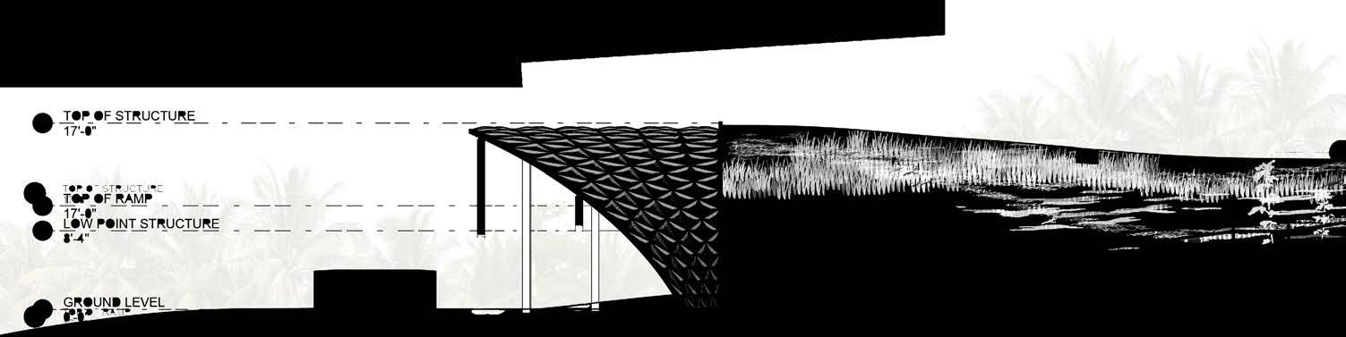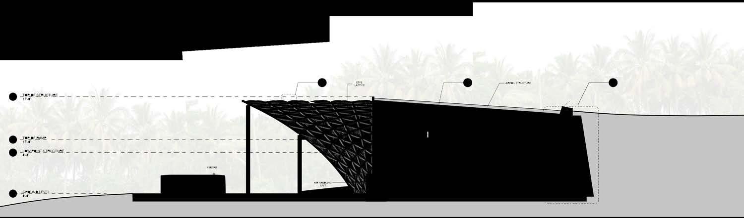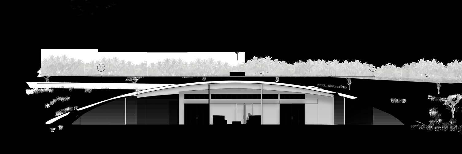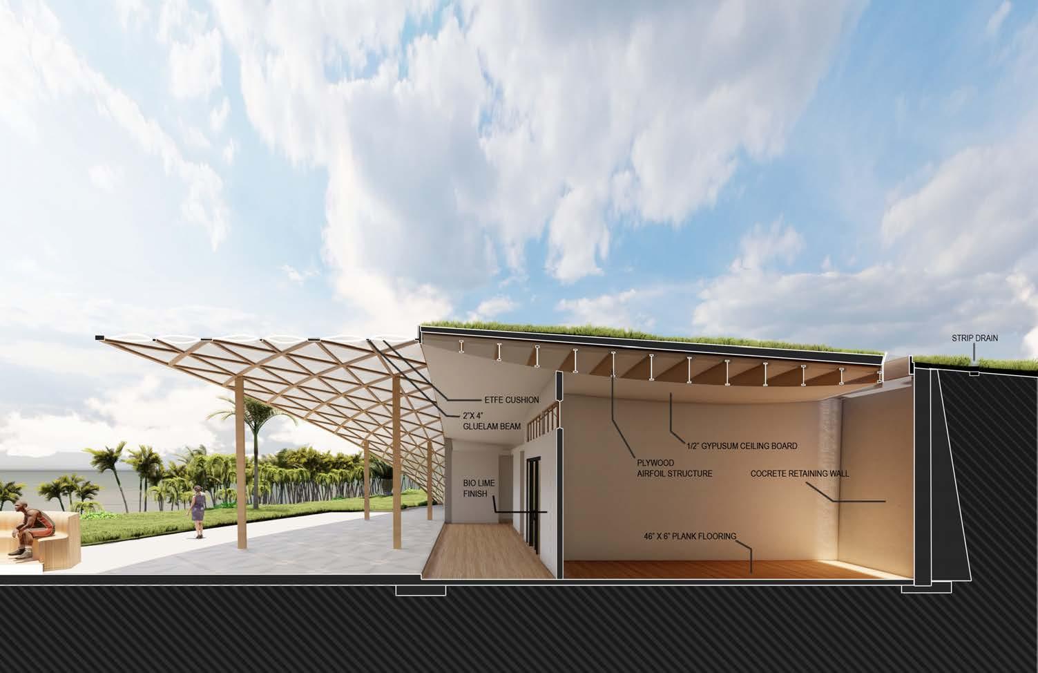 THE NEW AHUOUA’A MAGISTRATE LAND COURT TO BE FELT LIKE BEING RAISED FROM ANAHOLA (HAWAII) LANDSCAPE. AS YOU APPROACH THE SITE FROM THE ROAD, THE BUILDING APPEARS TO BE HIDDEN FROM SIGHT, INCREASING THE VIEWERS’ INTEREST. AS YOU ENTER THROUGH THE CANOPY STRUCTURE, MADE BY GLULAM LATTICE WITH DOUBLE LAY ERS OF ETFE CUSHION, YOU ARE FACED A WITH THE ONLY FAÇADE THAT REVEALS THE INTERIOR. THE INTERIOR SPACES ARE SURROUNDED BY 14-INCH RETAINING WALL THAT SUPPORTS A STRUCTURE THAT CONSISTS OF A PLYWOOD AEROFOIL STRUCTURE.