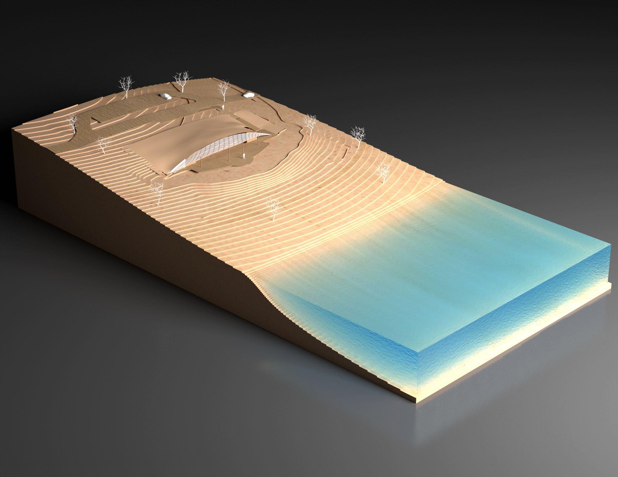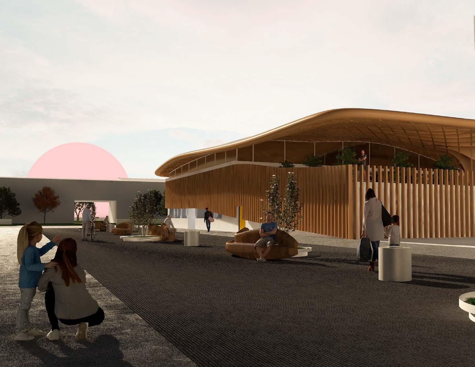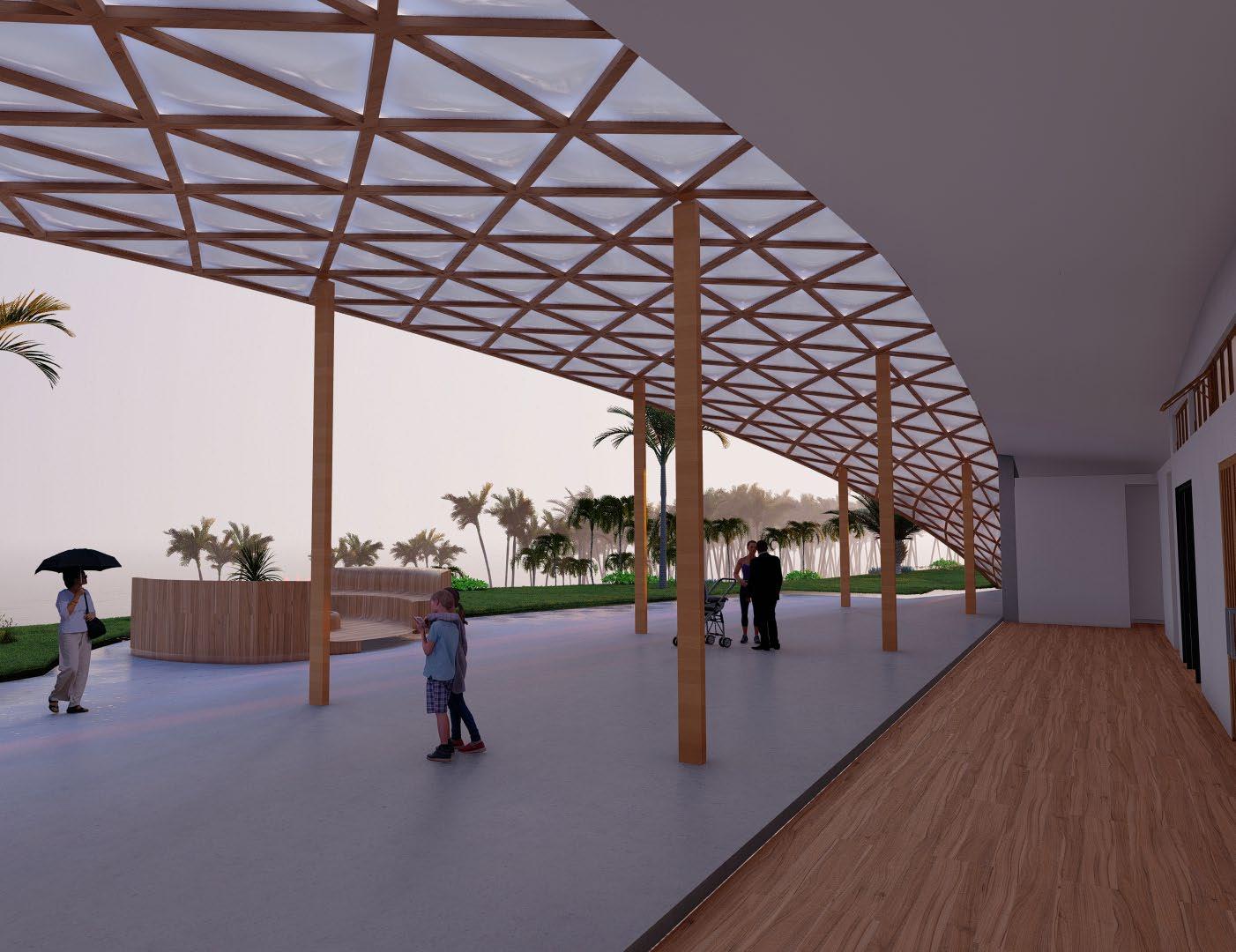 THE NEW AHUOUA’A MAGISTRATE LAND COURT TO BE FELT LIKE BEING RAISED FROM ANAHOLA (HAWAII) LANDSCAPE. AS YOU APPROACH THE SITE FROM THE ROAD, THE BUILDING APPEARS TO BE HIDDEN FROM SIGHT, INCREASING THE VIEWERS’ INTEREST. AS YOU ENTER THROUGH THE CANOPY STRUCTURE, MADE BY GLULAM LATTICE WITH DOUBLE LAY ERS OF ETFE CUSHION, YOU ARE FACED A WITH THE ONLY FAÇADE THAT REVEALS THE INTERIOR. THE INTERIOR SPACES ARE SURROUNDED BY 14-INCH RETAINING WALL THAT SUPPORTS A STRUCTURE THAT CONSISTS OF A PLYWOOD AEROFOIL STRUCTURE.