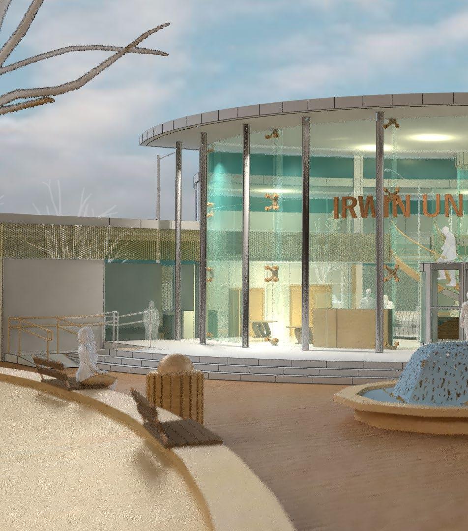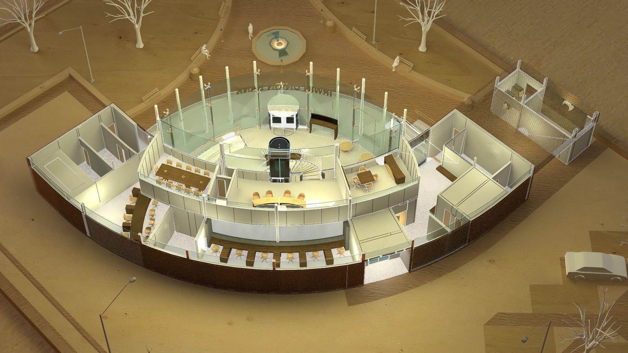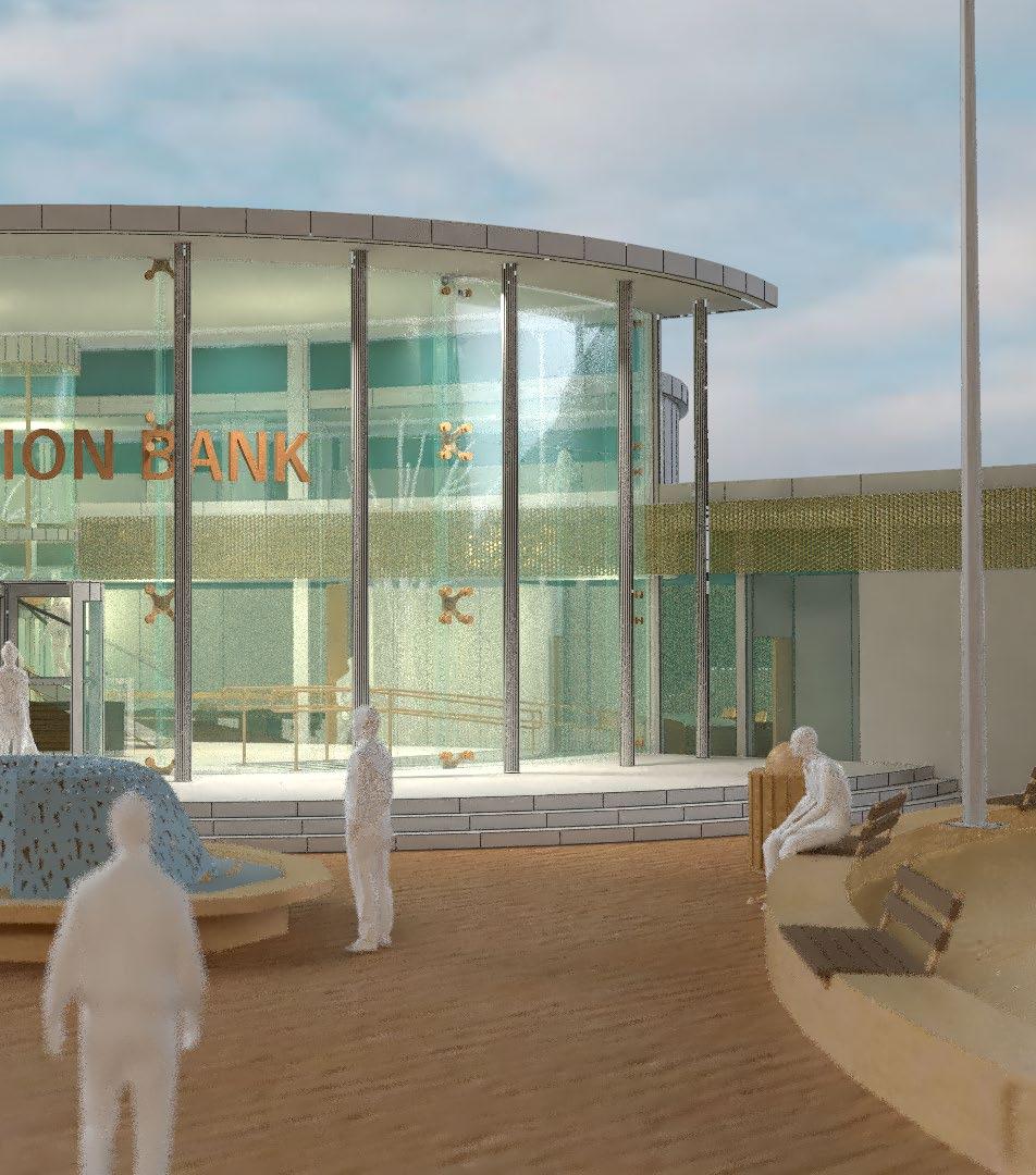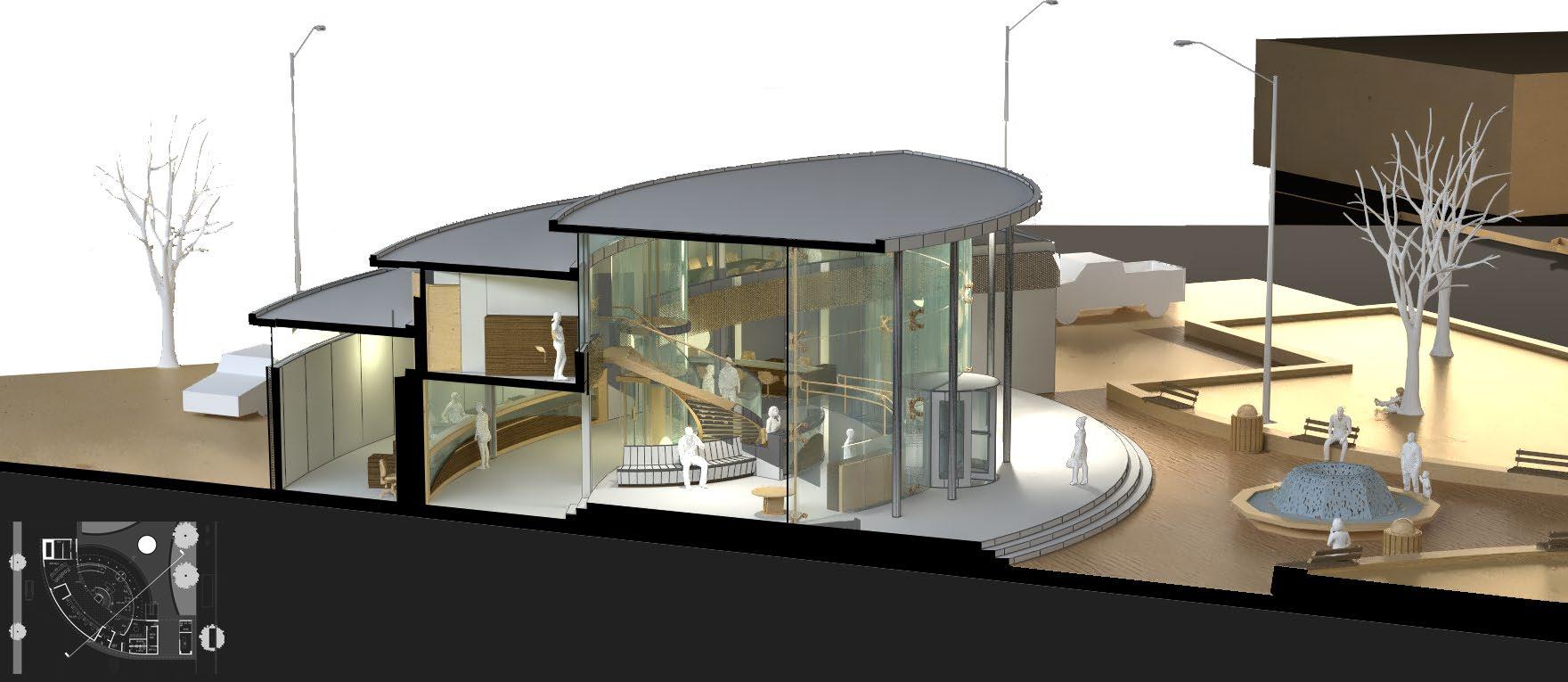 THE DESIGN CONCEPT BEGAN WITH HIGH CONSIDERATION OF THE SITE AND HIS HISTORIC POSITION IN KANSAS. TROOST AVENUE HAS HIS TORICALLY SERVED AS A DIVIDING LINE OF RACIST SEGREGATION AND DISINVESTMENT IN KANSAS CITY AND THIS IS STILL PRESENT NOWA DAYS. THE PROJECT RISES FROM THE IDEA OF BREAKING THAT SOCIAL DIVISION LINE AND PROVIDING ENGAGING MOMENTS FOR THE COMMUNITY. THE IDEOLOGY OF THE BUILDING ITSELF RELATES TO THE GEO METRIC SHAPE OF A CIRCLE WHICH IS ASSOCIATED WITH UNIFICATION AND SUSTAINABILITY. THE BANK ACTS AS ARMS, INVITING SOCIETY.