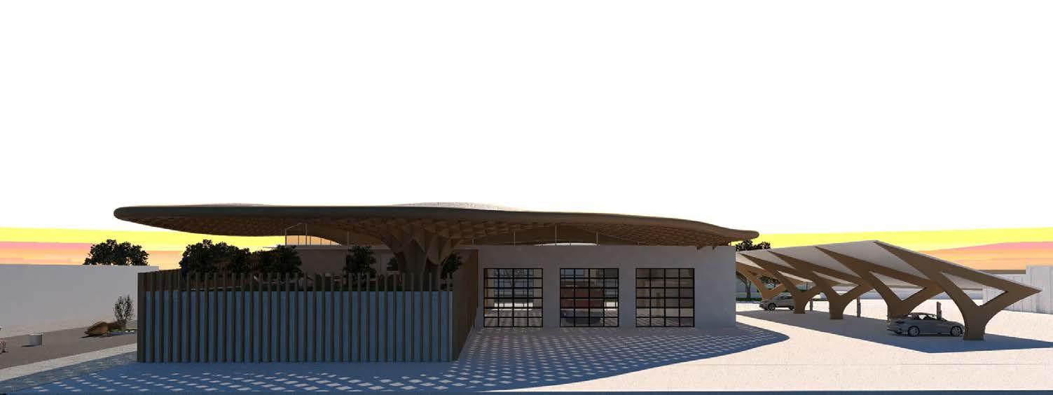 THE BUILDING ACTS AS A NEW FOOTPRINT BY BRINGING TO THE SITE A NEW CONCEPT OF WHAT A FIRE-STATION SHOULD BE AND REDIRECT ING WAMEGO’S AGENDA TO A MORE CARING, INSPIRING, CREATIVE AND WELCOMING FUTURE. THIS WAS ACHIEVED BY CELEBRATING THE FOUR ELEMENTS: WATER, FIRE, WIND AND EARTH BY ALLOWING THE WAFFLE ROOF STRUCTURE TO COLLECTING WATER, DEFINES GREEN SPACES AND ALLOW CROSS VENTILATION AND PASSIVE SOLAR GAIN. LIKE A TREE, THE COLUMN EMERGES FROM WAMEGO EARTH, INTERACTING WITH THE INTERIOR AND CREATES ENCLOSURE FOR FOR THE FIRE-STATION CRE ATING A GAMES OF SHADE AND SHADOW.