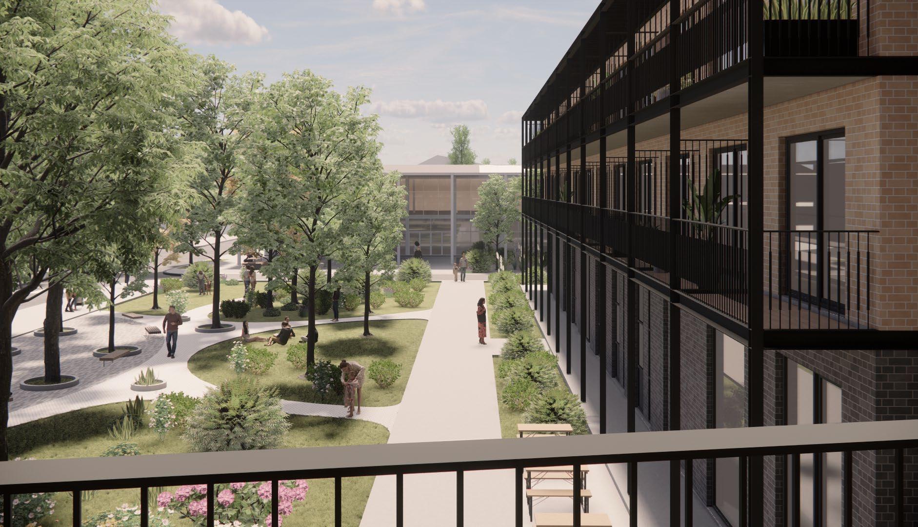 Vista peatonal espacio verde central.