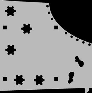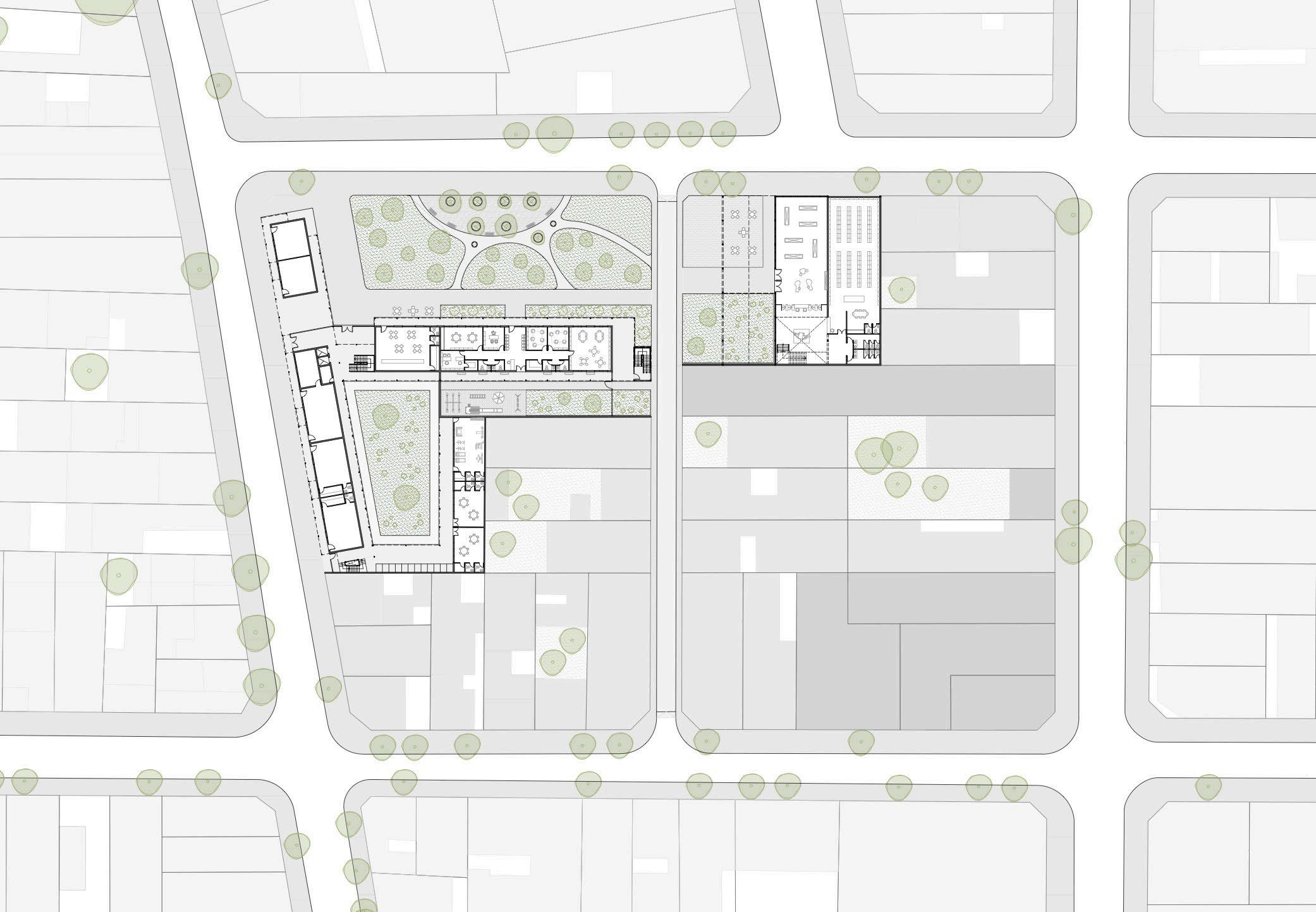 En la planta baja proyectamos una planta de libre circulación, con un zócalo comercial que va desde locales comerciales hasta un espacio de oficinas, además de un área productiva y educativa. En el centro de la misma, diagramamos una serie de espacios verdes, con una cancha deportiva y espacios de recreación al aire libre.