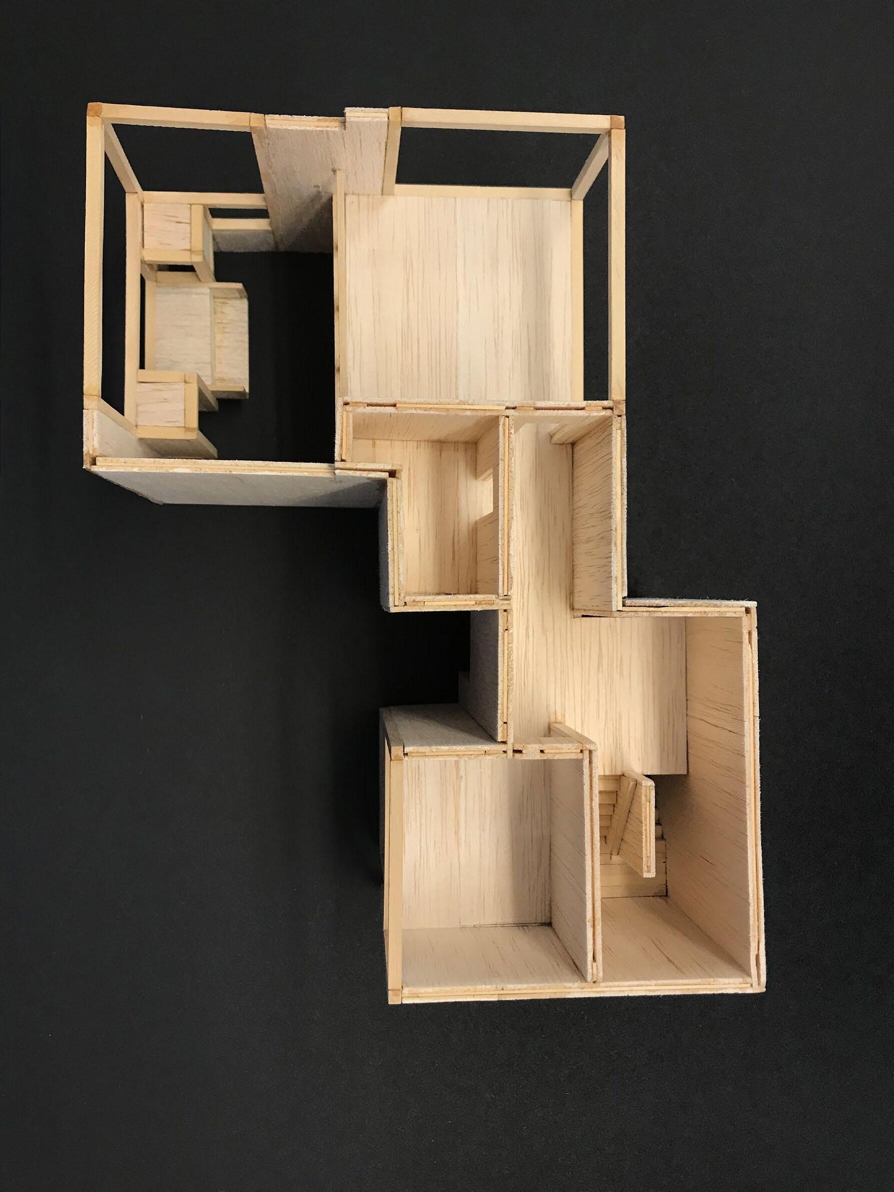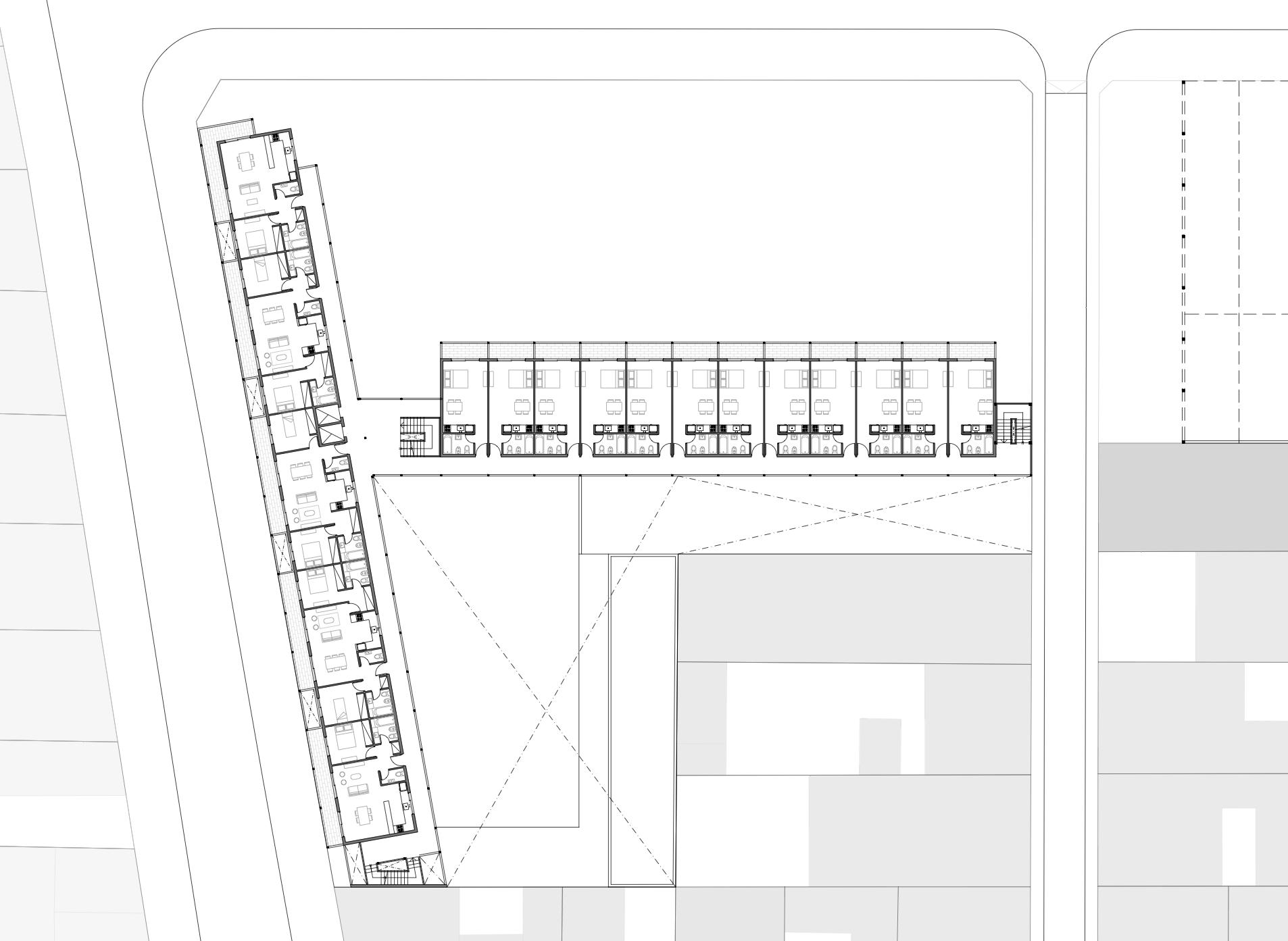 Para la unificación de estas tipologías de vivienda nos basamos en un planteo inicial de losas continuas con cajas sueltas distribuidas a lo largo de ellas, lo que nos permite disponerlas de manera tal que se genere un espacio de expansión de las viviendas y otro de circulación.