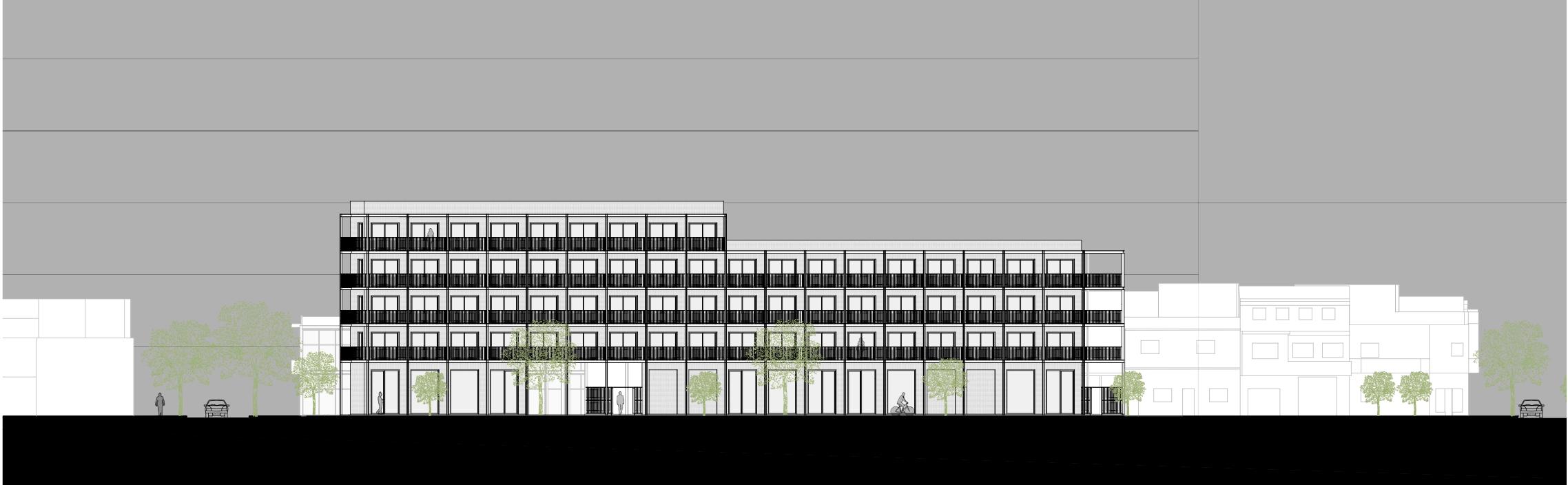 El complejo de viviendas, ubicado en el interior de la manzana, amplía el espacio público retirándose del frente, manteniendo los perímetros libres. El diseño se basa en dos cajas murarias de ladrillo con espacios de circulación y expansión adosados. El edificio incorpora áreas verdes, como una plaza barrial y un espacio privado más pequeño, favoreciendo la absorción del suelo y la interacción social.