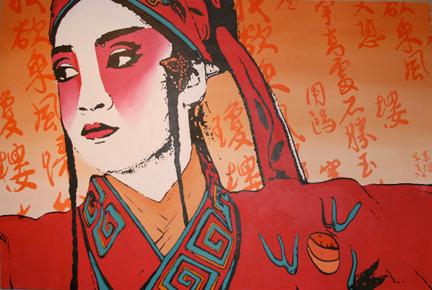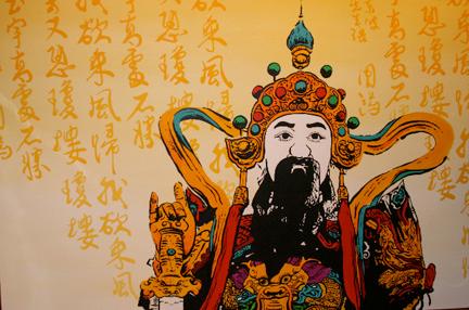 His large format canvanses in the exhibit focus on colorful Taiwanese cultural life temple gods, dragons and opera.