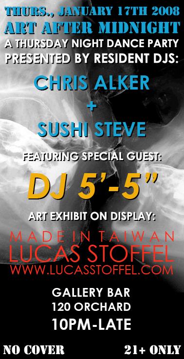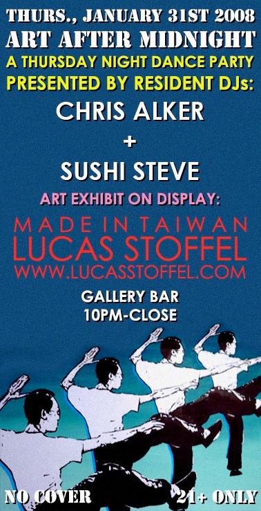 After Midnight party . The weekly Thursday party isn't doing anything special for the night, just doing the regular art and dance party steez. Tonight the art is provided by Lucas Stoffel, a pop-art exhibit called Made In Taiwan. Resident DJs Chris Alker and Sushi Steve will handle the dance party, helped out by guest DJ 5' 5". Expect lots of dance remixes, indie, some hip-hop and a good crowd. No cover, 21+.
